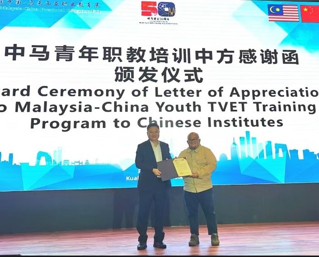 12日下午,陳念東校長(zhǎng)上臺(tái)領(lǐng)取了“中馬職業(yè)教育培訓(xùn)感謝函”。2024年是中馬建交50周年,也是中馬友誼年,中國(guó)駐馬來(lái)西亞大使館支持舉辦了中馬職業(yè)教育展并對(duì)中馬職業(yè)教育合作做出突出貢獻(xiàn)的中方院校頒發(fā)感謝函。