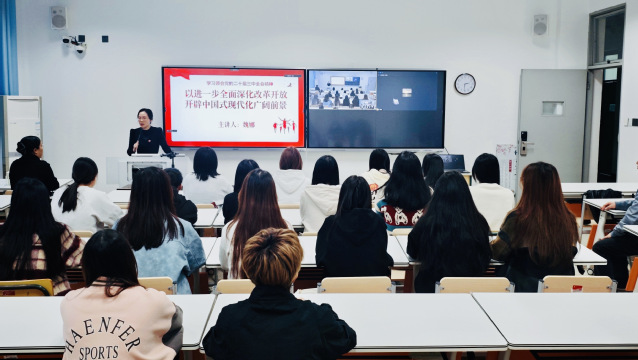 我校商學(xué)院黨委副書記魏娜圍繞《中共中央關(guān)于進(jìn)一步全面深化改革、推進(jìn)中國(guó)式現(xiàn)代化的決定》內(nèi)容,講授“學(xué)習(xí)貫徹黨的二十屆三中全會(huì)精神”專題黨課,從黨的二十屆三中全會(huì)的重大意義、進(jìn)一步全面深化改革的總體要求與系統(tǒng)部署、抓好黨的二十屆三中全會(huì)精神的貫徹落實(shí)等方面對(duì)全會(huì)精神進(jìn)行全面解讀,引導(dǎo)師生學(xué)習(xí)好、宣傳好、貫徹好全會(huì)精神。