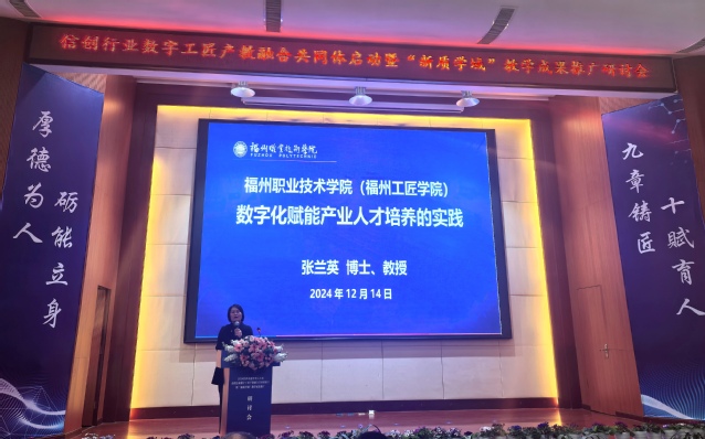 論壇交流環(huán)節(jié),專家圍繞職業(yè)院校數字工匠培養(yǎng)賦能新質生產力、AIGC時代院?!叭斯ぶ悄?”專業(yè)課程建設等主題作報告。張?zhí)m英副校長以《福州職業(yè)技術學院(福州工匠學院)數字化賦能產業(yè)人才培養(yǎng)的實踐》為主題,介紹學校緊密對接產業(yè)經濟發(fā)展,以數字化賦能教學,在產業(yè)人才培養(yǎng)過程中進行的探索和實踐,同時分享了福州工匠學院近年來的教育教學經驗。
