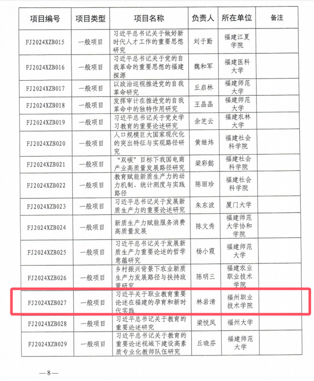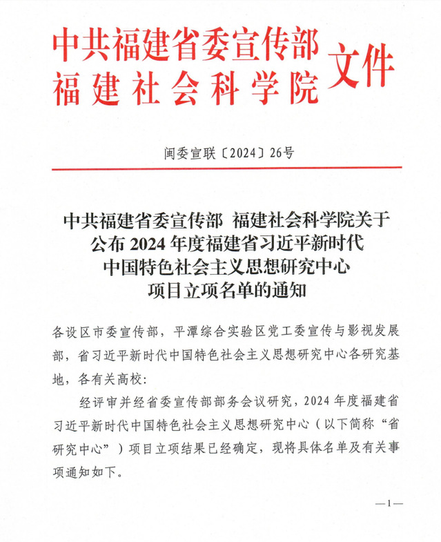 近日,中共福建省委宣傳部、福建社會(huì)科學(xué)院發(fā)布《中共福建省委宣傳部福建社會(huì)科學(xué)院關(guān)于公布2024年度福建省習(xí)近平新時(shí)代中國(guó)特色社會(huì)主義思想研究中心項(xiàng)目立項(xiàng)名單的通知》(閩委宣聯(lián)〔2024〕26號(hào)),我校馬克思主義學(xué)院林巖清老師申報(bào)的《習(xí)近平關(guān)于職業(yè)教育重要論述在福建的孕育和新時(shí)代實(shí)踐》項(xiàng)目,獲批2024年度福建省習(xí)近平新時(shí)代中國(guó)特色社會(huì)主義思想研究中心項(xiàng)目立項(xiàng)(納入省社科基金)。