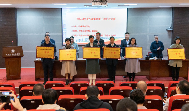 與會校領(lǐng)導(dǎo)為學(xué)校2024屆畢業(yè)生就業(yè)創(chuàng)業(yè)工作先進(jìn)集體頒獎,劉春蘭副書記、饒緒黎副校長分別宣讀了上級和學(xué)校有關(guān)就業(yè)創(chuàng)業(yè)工作獲獎名單和表彰文件。