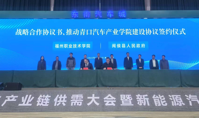 近日,由閩侯縣人民政府、福州市工業(yè)和信息化局共同主辦的東南汽車城汽車產(chǎn)業(yè)鏈供需大會暨新能源汽車產(chǎn)業(yè)聯(lián)盟年會在東南汽車城汽車技術推廣中心舉行。在戰(zhàn)略合作簽約儀式上,福州職業(yè)技術學院與閩侯縣人民政府簽訂《戰(zhàn)略合作協(xié)議書》《推動青口汽車產(chǎn)業(yè)學院建設協(xié)議》,福州市副市長趙明正,我校校長陳念東,閩侯縣縣長施家雄,市工業(yè)和信息化局局長陳志毅出席并見證簽約。副校長饒緒黎代表學校與閩侯縣副縣長陳晟簽署協(xié)議,副校長包良燁以及學校相關職能部門負責人參加活動。