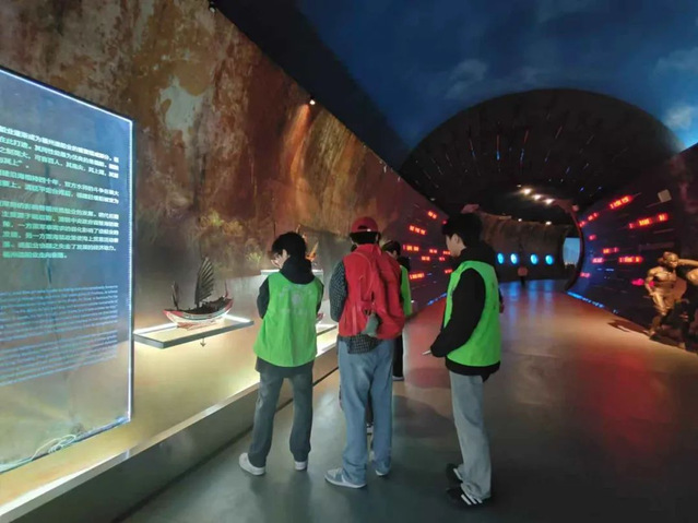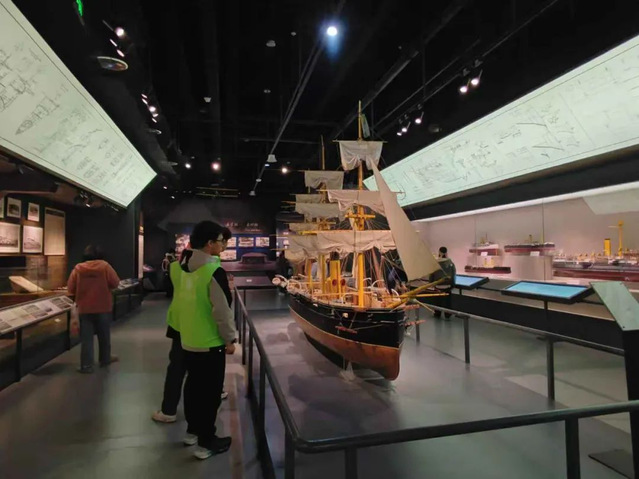 在中國(guó)船政博物館,“船政傳薪實(shí)踐隊(duì)”深入了解了木帆船時(shí)期的傳統(tǒng)造船工藝、鐵脅木殼船的混合材料應(yīng)用,以及鋼鐵船體的現(xiàn)代工業(yè)技術(shù),深刻感受到各個(gè)時(shí)期工匠的對(duì)技藝的執(zhí)著追求、對(duì)品質(zhì)的精益求精以及對(duì)創(chuàng)新的不懈探索。隊(duì)員們還參與場(chǎng)館志愿服務(wù),協(xié)助人員分流并講解船政歷史、弘揚(yáng)船政文化。在船政時(shí)光隧道,隊(duì)員們沉浸式探索馬尾船政的輝煌歷史,學(xué)習(xí)馬尾船政在工業(yè)、科技和建筑領(lǐng)域的成就。從“平遠(yuǎn)”號(hào)軍艦?zāi)P偷今R尾福建船政建筑群圖片,隊(duì)員們感受到船政人的智慧與中西文化的交融,深刻領(lǐng)悟了“愛國(guó)、科學(xué)、創(chuàng)新、圖強(qiáng)”的船政精神。