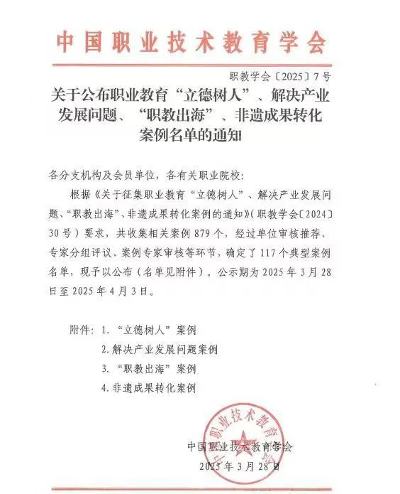 近日,中國職業(yè)技術(shù)教育學會發(fā)布《關(guān)于公布職業(yè)教育“立德樹人”、解決產(chǎn)業(yè)發(fā)展問題、“職教出海”、非遺成果轉(zhuǎn)化案例名單的通知》,我校報送的《非遺(福州曲藝)傳承“一中心、二依托、三融合”滲透式美育模式的構(gòu)建與實踐》成功入選“非遺成果轉(zhuǎn)化”典型案例。