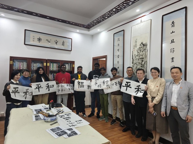 活動(dòng)伊始,薩曉靜老師以“和平”二字為切入點(diǎn),帶領(lǐng)國(guó)際學(xué)生體驗(yàn)書(shū)法藝術(shù),解析漢字的空間美學(xué)與哲學(xué)內(nèi)涵,展現(xiàn)中華“和合”文化的當(dāng)代價(jià)值。留學(xué)生們?cè)诠P墨互動(dòng)中感受漢字魅力,現(xiàn)場(chǎng)反響熱烈。隨后,“來(lái)華學(xué)生閱讀專(zhuān)區(qū)”正式啟動(dòng),該專(zhuān)區(qū)精選700余冊(cè)多語(yǔ)種書(shū)籍,涵蓋漢語(yǔ)學(xué)習(xí)、當(dāng)代中國(guó)研究等主題,并設(shè)置“一帶一路”文獻(xiàn)專(zhuān)架。通過(guò)分級(jí)標(biāo)引和場(chǎng)景化陳列,降低信息獲取門(mén)檻,精準(zhǔn)服務(wù)國(guó)際學(xué)生需求。
