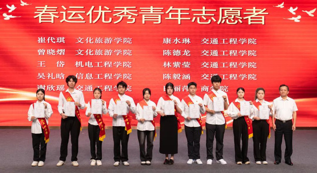 劉春蘭副書記宣讀《關(guān)于表彰2024年度福州職業(yè)技術(shù)學(xué)院“紅旗團(tuán)(總)支部”“優(yōu)秀共青團(tuán)干部”及“優(yōu)秀共青團(tuán)員”的決定》。張?zhí)m英副校長(zhǎng)宣讀學(xué)校2024年“勵(lì)園志愿之星”評(píng)選結(jié)果。福州火車站團(tuán)委副書記賴海燕宣布2025年鐵路春運(yùn)優(yōu)秀志愿者表彰名單。