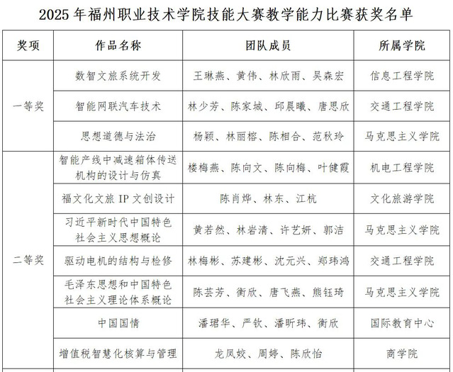 為深化職業(yè)教育改革,進(jìn)一步提升教師教學(xué)創(chuàng)新水平,近日,學(xué)校成功舉辦2025年福州職業(yè)技術(shù)學(xué)院技能大賽教學(xué)能力比賽。各學(xué)院共提交參賽作品28份,94位教師同臺(tái)競(jìng)技,展現(xiàn)職教風(fēng)采。經(jīng)過(guò)激烈角逐,產(chǎn)生一等獎(jiǎng)3項(xiàng),二等獎(jiǎng)7項(xiàng),三等獎(jiǎng)8項(xiàng)。