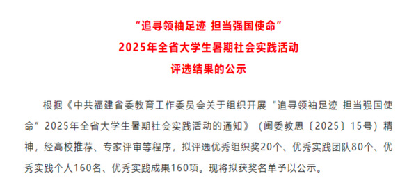 近日,中共福建省委教育工作委員會發(fā)布《“追尋領(lǐng)袖足跡 擔(dān)當(dāng)強(qiáng)國使命” 2025年全省大學(xué)生暑期社會實(shí)踐活動評選結(jié)果的公示》,校團(tuán)委聯(lián)合文化旅游學(xué)院組建的《榕職青旅興廷隊(duì)》榮獲“優(yōu)秀實(shí)踐團(tuán)隊(duì)”,教師張少鵬、戴飛銘榮獲“優(yōu)秀實(shí)踐個人”榮譽(yù)稱號。