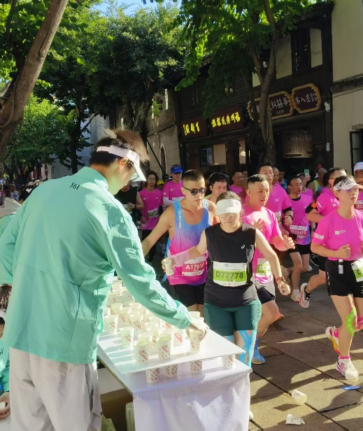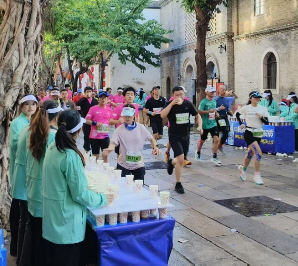 “您好!需要水還是飲料?”“加油!堅持?。 睘榱舜_保選手能快速取用,志愿者們默契配合:一人提前將瓶蓋擰松至適宜程度,并將水杯斟至三分之二(既方便抓取又不易灑濺);一人穩(wěn)穩(wěn)遞出補給,同時送上簡短的鼓勵;還有一人時刻觀察跑者狀態(tài),隨時準備提供額外幫助。選手在領取飲用水時,點頭或微笑向志愿者表達了感謝?!八麄冞f過來的不僅是水,更是一份安心?!币晃粎①愡x手劉女士賽后感慨道。