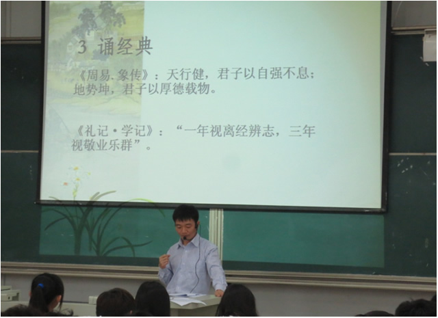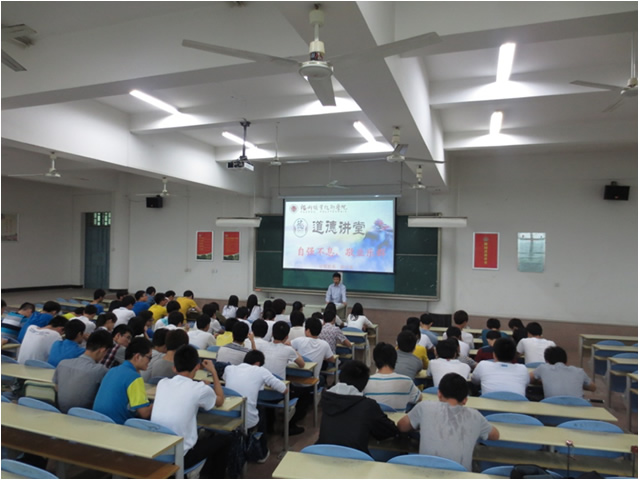 為進(jìn)一步提升我院學(xué)生的道德水平,傳播中華傳統(tǒng)美德,2014年4月23日,計算機系舉辦了“自強不息,敬業(yè)樂群――道德講堂”活動,通過講身邊故事、誦道德經(jīng)典、唱道德歌曲、學(xué)生代表談道德感悟、向“德”鞠躬、送吉祥、倡議“一堂一善事”的形式,積極倡導(dǎo)艱苦奮斗,助人為樂、見義勇為、誠實守信、敬業(yè)奉獻(xiàn)、孝老愛親等行為。 本次道德講堂活動以“自強不息,敬業(yè)樂群”為主題,由計算機系陳可新老師主講,計算機系一百多名學(xué)生參加講座。陳老師首先說明了學(xué)院勵園道德講堂對于宣傳和傳播傳統(tǒng)美德的重要作用,通過帶領(lǐng)同學(xué)們誦讀《周易》經(jīng)典名句“天行健,君子以自強不息;地勢坤,君子以厚德載物”以及《禮記》“一年視離經(jīng)辨志,三年視敬業(yè)樂群”,導(dǎo)入本次道德講壇的主題內(nèi)容,鼓勵同學(xué)們自強奮斗,勤奮學(xué)習(xí),做好自己職業(yè)生涯規(guī)劃,并且在日常生活中學(xué)會包容,與周圍的同學(xué)互相學(xué)習(xí)、共同進(jìn)步。在講堂活動中陳老師還帶領(lǐng)大家學(xué)習(xí)了感動福建十大人物、全國大學(xué)生自強之星、福建三明學(xué)院外語系學(xué)生曹陽飛宇邊上大學(xué)、邊悉心照顧生病父親的感人故事,讓參加講座的同學(xué)體驗到一名同齡人的自強和奮斗精神。整個講堂活動氣氛熱烈,計算機系2013級張家旺和陳群同學(xué)先后上臺和同學(xué)們分享了自己的道德感悟。最后陳老師用《荀子.勸學(xué)》中的“不積跬步,無以至千里;不積小流,無以成江?!钡冉?jīng)典名句鼓勵同學(xué)們在學(xué)習(xí)中堅持不懈,自強不息,從小事做起,不斷提高自己的道德修養(yǎng)水平,并祝愿同學(xué)們能擁有屬于自己的美好大學(xué)生活。 本次道德講堂活動,通過誦讀道德經(jīng)典,共唱革命歌曲,送上美好祝福,促進(jìn)了學(xué)院計算機系良好道德風(fēng)氣的形成,同學(xué)們深深體會到只有從小善做起,不斷積累提升,才能成為一個有道德的當(dāng)代大學(xué)生。
