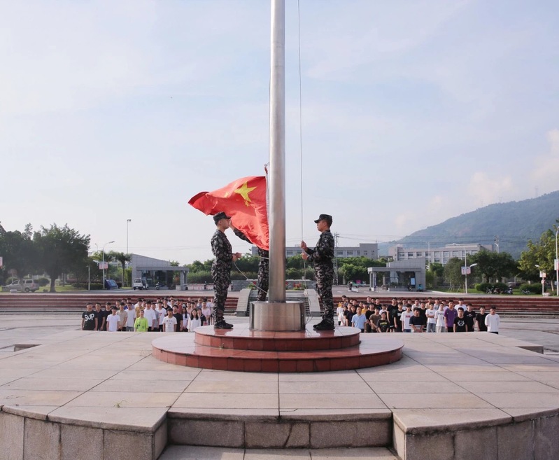 在鏗鏘有力、整齊劃一的腳步聲中,鮮艷的五星紅旗由國(guó)旗班護(hù)送來(lái)到升旗臺(tái),伴隨著莊嚴(yán)的國(guó)歌冉冉升起,全體人員面向國(guó)旗肅立行注目禮,齊聲高唱國(guó)歌,激情澎湃。