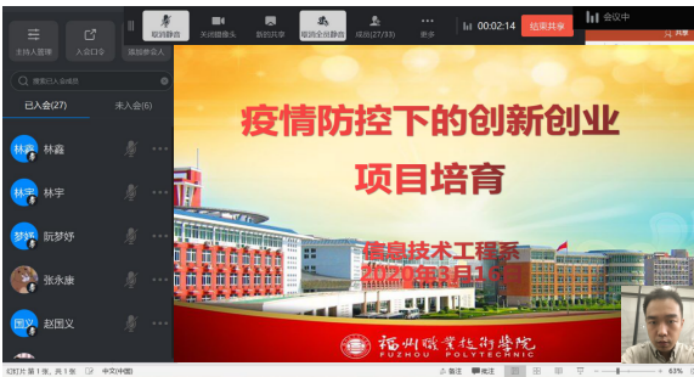 為在疫情防控形勢下把握問題導向,抓住線上產(chǎn)業(yè)的發(fā)展機遇,深入推進創(chuàng)新創(chuàng)業(yè)教育,信息技術(shù)工程系于2020年3月16日開展疫情防控下的創(chuàng)新創(chuàng)業(yè)項目培育專題線上講座。系團總支書記陳力鈞擔任此次報告主講人,全系各個重點創(chuàng)業(yè)項目團隊成員、各班級學生代表參與此次在線講座。