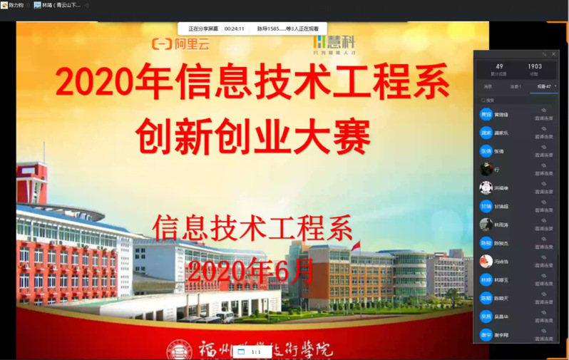 6月29日,信息技術(shù)工程系2020年大學(xué)生創(chuàng)新創(chuàng)業(yè)大賽決賽通過(guò)釘釘網(wǎng)絡(luò)平臺(tái)順利舉行。學(xué)校創(chuàng)新創(chuàng)業(yè)辦公室林靖老師、系團(tuán)總支書(shū)記陳力鈞、慧科集團(tuán)福建運(yùn)營(yíng)主管黃飛擔(dān)任此次大賽的評(píng)委,入圍決賽十支隊(duì)伍、指導(dǎo)老師及學(xué)生觀眾等近200人參加了本次活動(dòng)。