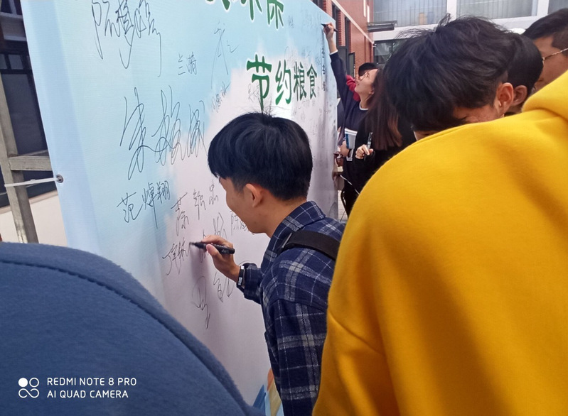 首先,組織同學(xué)們觀看關(guān)于“垃圾分類”和“節(jié)約糧食”主題的紀錄片共一百多人次,并配合PPT做深入的講解;其次,開展“低碳環(huán)保,節(jié)約糧食”百人簽名活動?;顒蝇F(xiàn)場,同學(xué)們積極踴躍,在簽名墻上鄭重簽下名字。
