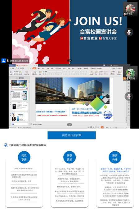 5月26日,為踏入實習的2022屆軟件技術(shù)專業(yè)同學們提供就業(yè)崗位,促進留溫就業(yè)。2022年5月26日上午,阿里巴巴大數(shù)據(jù)學院&慧科成功舉辦企業(yè)宣講會,此次邀請了兩家企業(yè):合富置業(yè)有限公司和寶旭網(wǎng)絡(luò)科技有限公司,采用騰訊會議線上的模式為同學們帶來介紹。