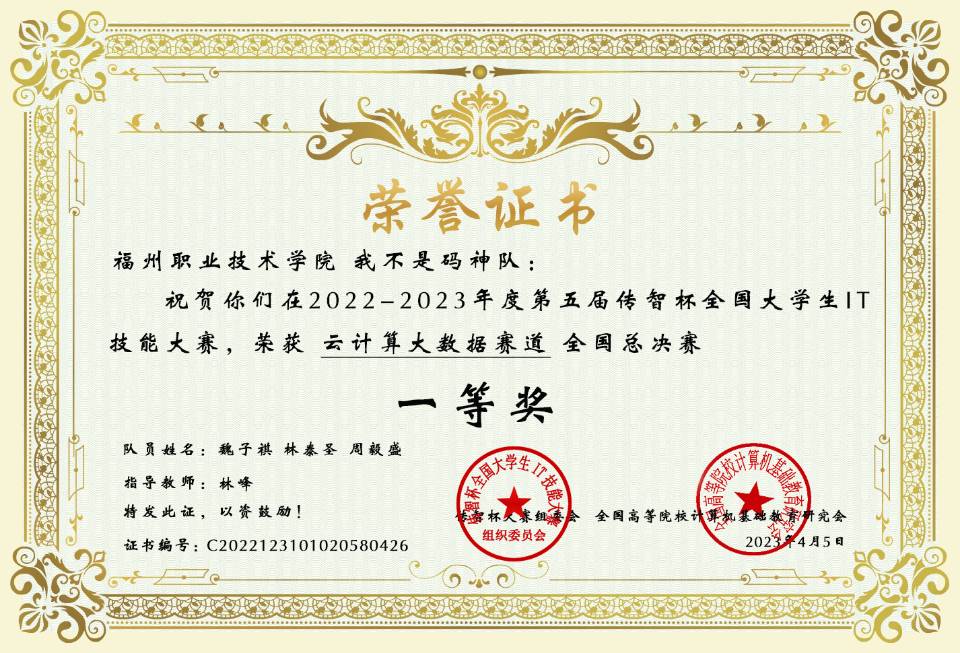 近日由全國高等院校計算機基礎教育研究會主辦的2022-2023年度第五屆傳智杯全國大學生IT技能大賽公布結果,由來自信息工程系軟件技術專業(yè)的魏子祺、林泰圣、周毅盛等三名同學組成的競賽團隊,在林峰老師的指導下,最終取得云計算大數(shù)據(jù)賽道全國總決賽一等獎的好成績。