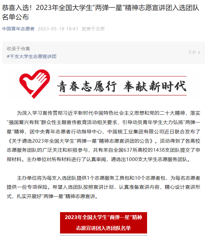 近日,中國(guó)青年志愿者官方微信公眾號(hào)公布了2023年全國(guó)大學(xué)生“兩彈一星”精神志愿宣講團(tuán)入選團(tuán)隊(duì)名單,我系“燈塔志愿宣講團(tuán)”成功入選。