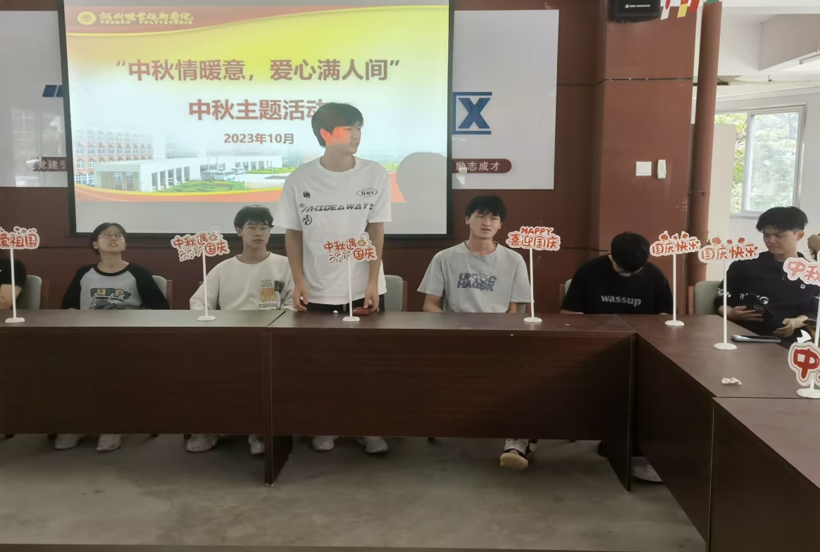 為弘揚優(yōu)秀傳統(tǒng)文化,培養(yǎng)學(xué)生愛國愛校情懷,10月2日,信息工程系在一站式學(xué)生社區(qū)南區(qū)共享中心開展“中秋情暖意,愛心滿人間”主題活動,輔導(dǎo)員老師和部分留校學(xué)生參加。
