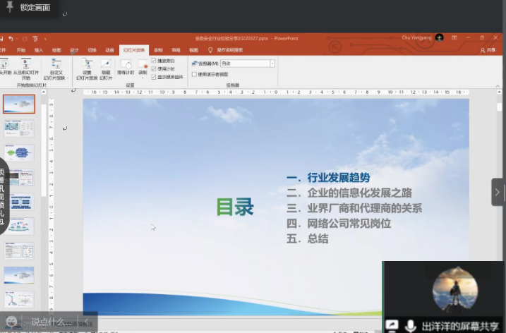 在訪談過(guò)程中,出洋洋畢業(yè)以來(lái)的工作經(jīng)歷,詳細(xì)介紹了從事網(wǎng)絡(luò)安全工作的具體內(nèi)容、所需的專業(yè)能力、行業(yè)發(fā)展前景以及自身的職業(yè)發(fā)展經(jīng)驗(yàn)等,并就學(xué)生關(guān)心的求職擇業(yè)問(wèn)題進(jìn)行了積極回答,與參會(huì)同學(xué)展開充分互動(dòng)。隨后,出洋洋從網(wǎng)絡(luò)安全技術(shù)、產(chǎn)業(yè)政策、市場(chǎng)需求等角度解析了網(wǎng)絡(luò)安全行業(yè)面臨的機(jī)遇與挑戰(zhàn),詳細(xì)介紹了各具體分支領(lǐng)域的發(fā)展現(xiàn)狀與趨勢(shì),以及未來(lái)網(wǎng)絡(luò)安全人才的需求方向。