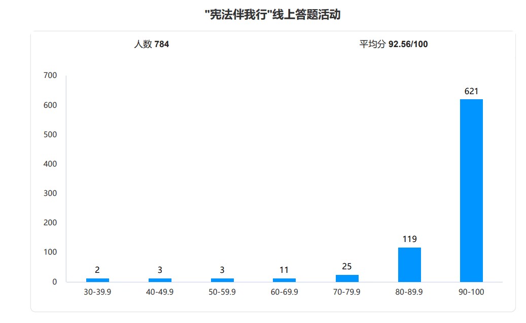 本次活動采用線上答題的方式,內(nèi)容緊扣今年的“憲法宣傳周”主題“大力弘揚憲法精神,建設社會主義法治文化”,答題形式包括單選題、多選題和判斷題。隨著線上答題活動的開展,同學們反響熱烈,他們利用課余時間,通過手機、電腦等渠道積極參與答題。無論是對于憲法的核心內(nèi)容,還是對于憲法在日常生活中的應用,同學們都認真作答?;顒赢斕旃灿?/span>784位同學參與答題,取得了92.56的平均成績,展現(xiàn)了信息工程系大學生積極學法、知法、普法的良好精神面貌。