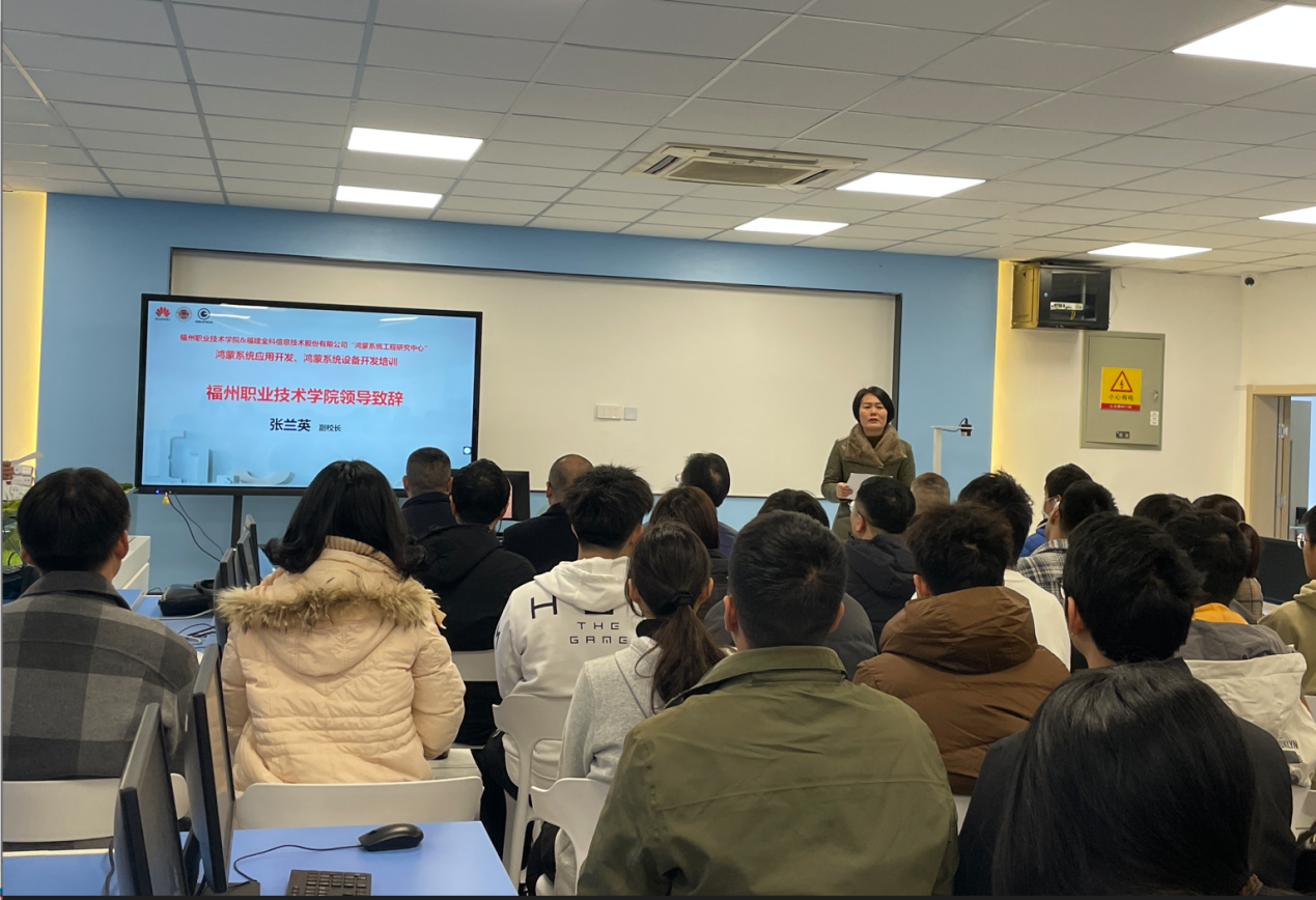 張?zhí)m英副校長參加此次開班儀并致辭,介紹了福州職業(yè)技術(shù)學院以及信息工程系的基本情況。強調(diào)鴻蒙系統(tǒng)作為華為推出的新一代智能終端操作系統(tǒng),對鴻蒙開發(fā)有著極大的需求。此次培訓契合學校的發(fā)展規(guī)劃,不僅對接市場需求來培養(yǎng)人才,還能為技術(shù)服務儲備人才,為學生創(chuàng)新創(chuàng)業(yè)提供機會。希望大家在培訓過程當中不僅要學習技術(shù)知識,更要思考如何將知識轉(zhuǎn)化為實際生產(chǎn)力,為將來的技術(shù)發(fā)展貢獻我們福職的智慧和力量。