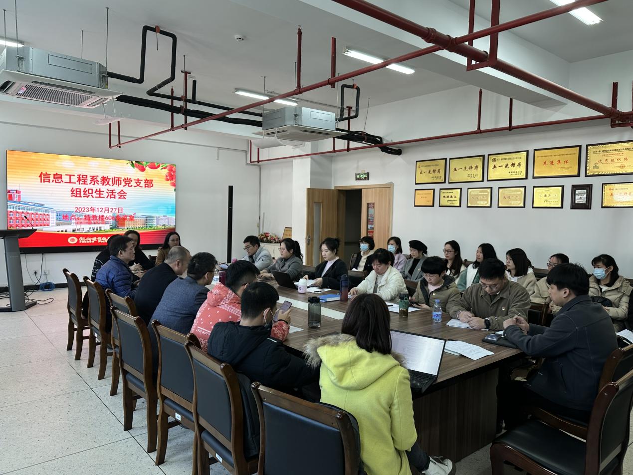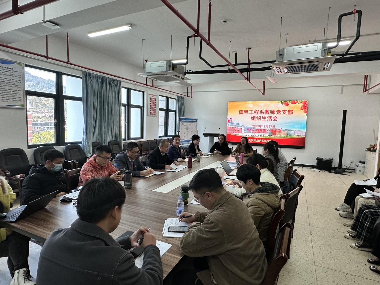 2023年12月27日,按照學校黨委的工作部署,信息工程系教師黨支部召開了“學習貫徹習近平新時代中國特色社會主義思想主題教育”專題組織生活會,本次組織生活會邀請了系黨總支書記陳樂平以及智能工程系黨總支書記林藝芳、建筑工程系黨總支副書記葉彩虹、商務系黨總支副書記楊君前來觀摩。會議由支部書記林風人同志主持。