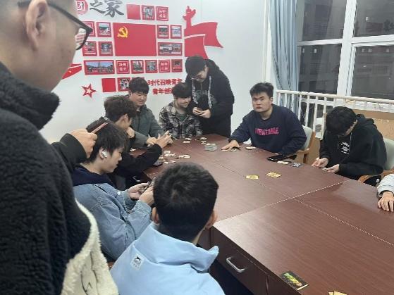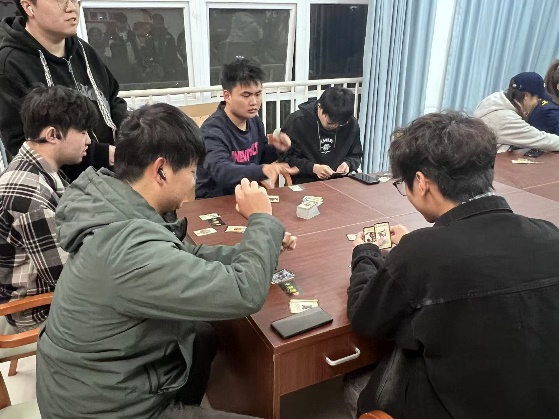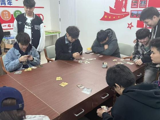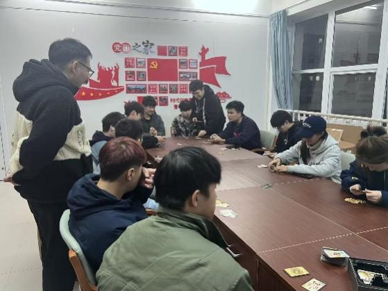 活動于晚上7:30正式開始,吸引了大量同學(xué)積極參與?;顒觾?nèi)容豐富多樣,通過組織桌面游戲如三國殺、UNO、阿瓦隆、狼人殺等,大家在輕松愉快的氛圍中放松心情,緩解了因期末復(fù)習(xí)而產(chǎn)生的焦慮與疲憊。游戲不僅讓同學(xué)們暫時忘卻了學(xué)業(yè)壓力,也增強(qiáng)了彼此之間的互動與團(tuán)隊(duì)合作精神。