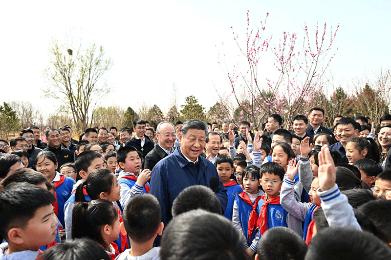 4月3日,黨和國(guó)家領(lǐng)導(dǎo)人習(xí)近平、李強(qiáng)、趙樂際、王滬寧、蔡奇、丁薛祥、李希、韓正等來(lái)到北京市豐臺(tái)區(qū)永定河畔參加首都義務(wù)植樹活動(dòng)。這是習(xí)近平同在場(chǎng)的干部群眾、少先隊(duì)員親切交談。(新華社記者 燕雁/攝)