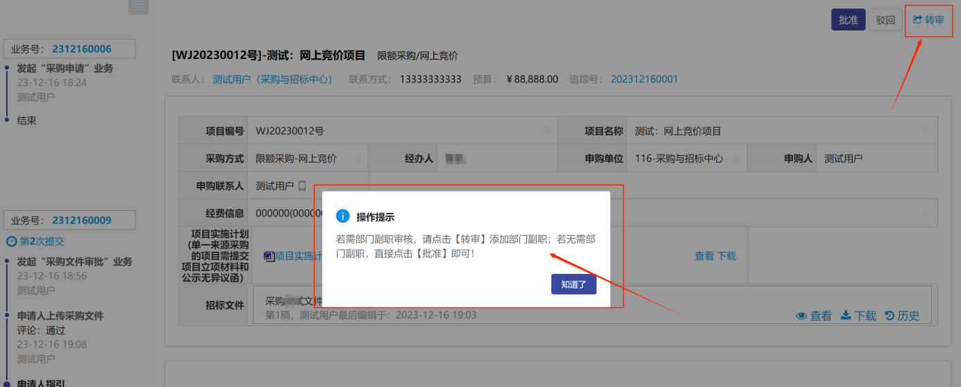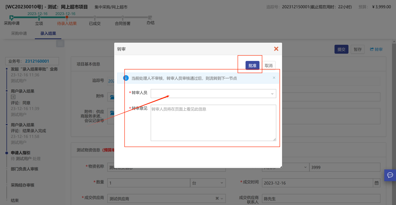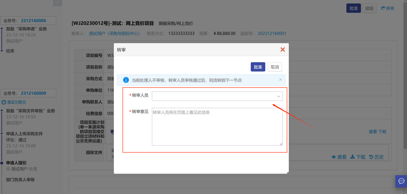 如需轉(zhuǎn)審,點(diǎn)擊右上角的“轉(zhuǎn)審”按鈕,選擇轉(zhuǎn)身人員,然后點(diǎn)擊【批準(zhǔn)】如圖所示:
