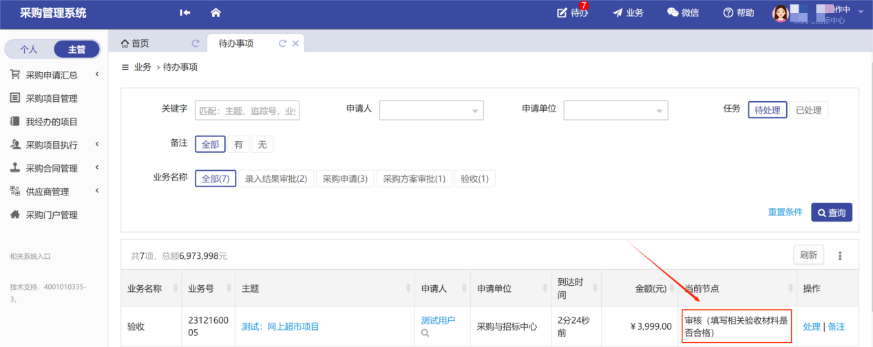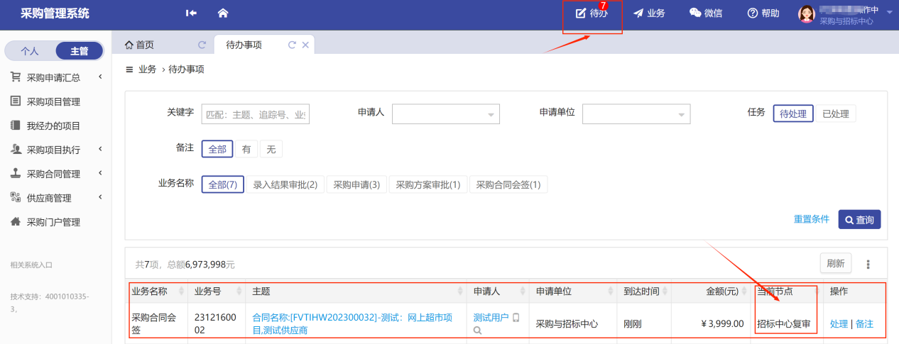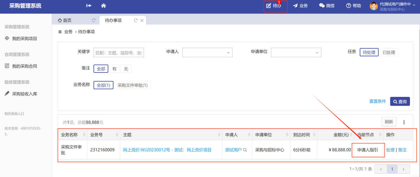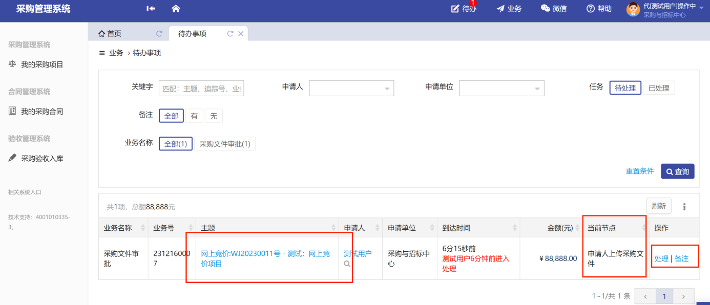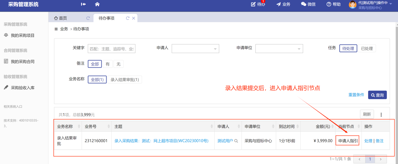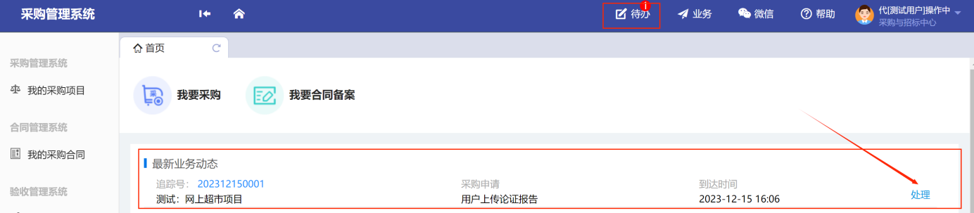 后續(xù)的“錄入結(jié)果審核”、“合同審核”、“項(xiàng)目驗(yàn)收審核”的操作基本一致,同樣是在待辦處選擇需要審批的待辦項(xiàng)目,點(diǎn)擊“處理”,如圖所示: