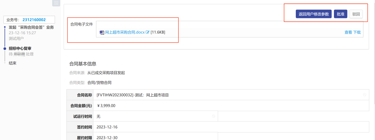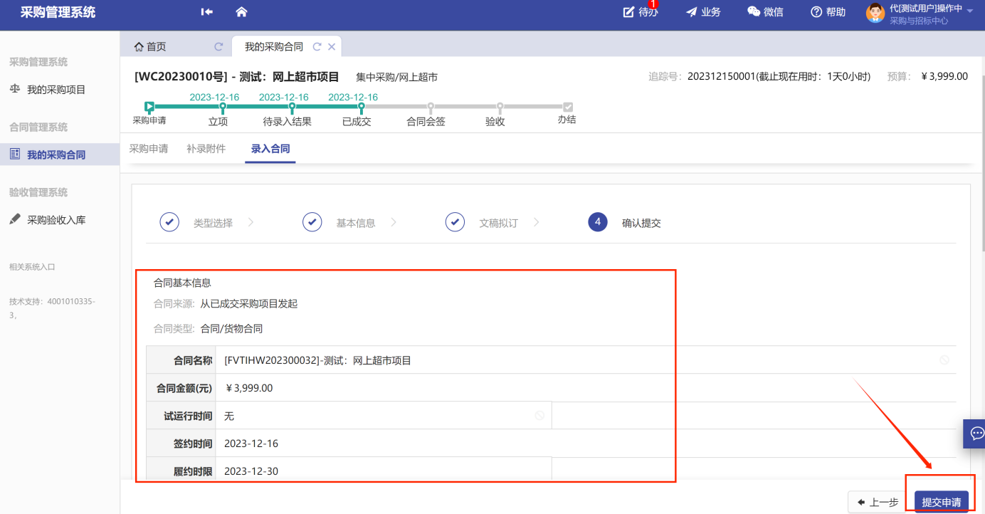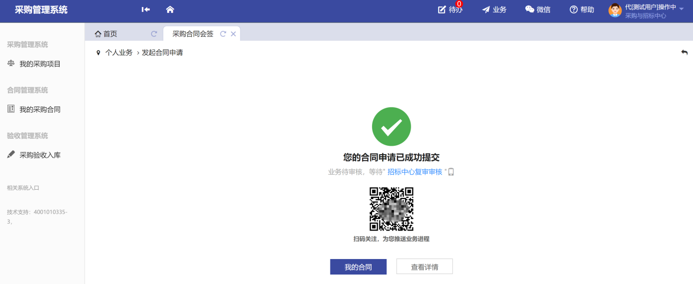第六步:確認(rèn)所填合同信息,點(diǎn)擊“提交”,等待招標(biāo)中心復(fù)審審核,如圖所示: