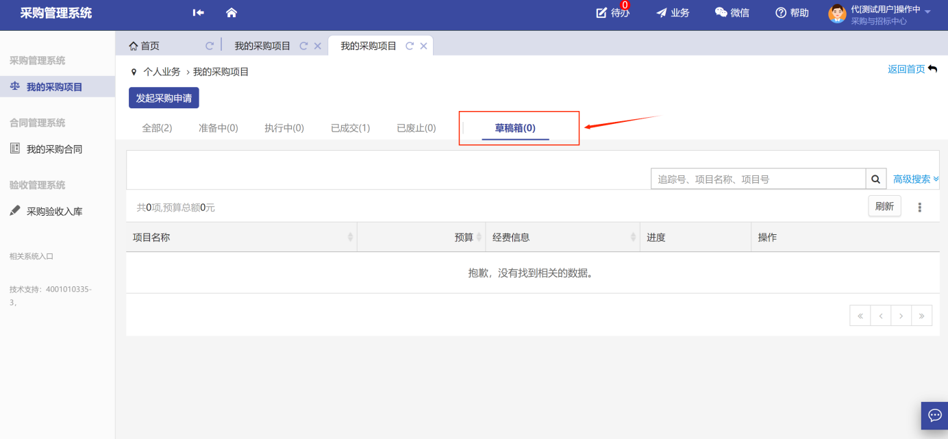 未提交或暫存項(xiàng)目,在【我的采購項(xiàng)目】-【草稿箱】中查看,如圖所示: