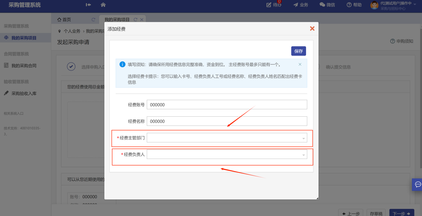 選擇對(duì)應(yīng)的經(jīng)費(fèi)主管部門和經(jīng)費(fèi)負(fù)責(zé)人: