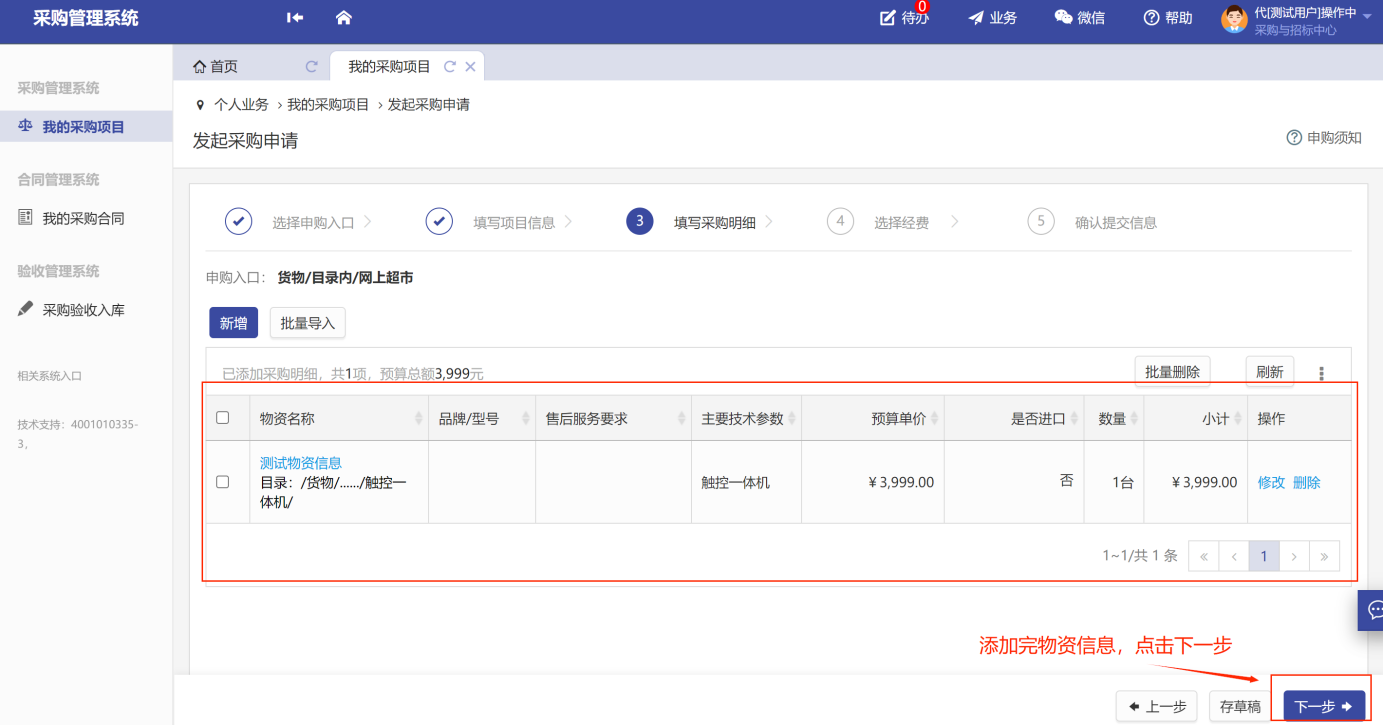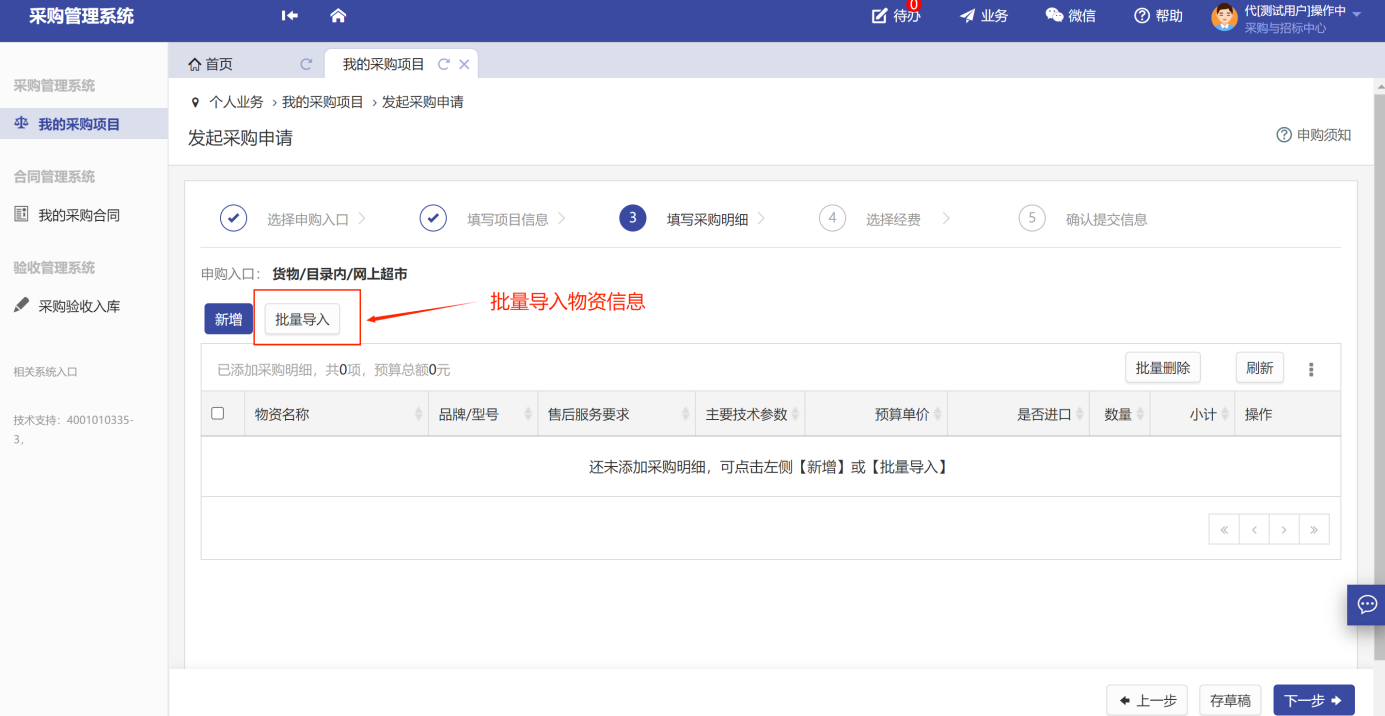 注:若項(xiàng)目存在多個(gè)物資,可批量導(dǎo)入,繼續(xù)填寫。