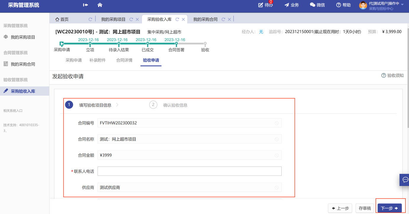 第三步:填寫驗(yàn)收的相關(guān)信息以及上傳“驗(yàn)收?qǐng)?bào)告”后點(diǎn)擊下一步,如圖所示: