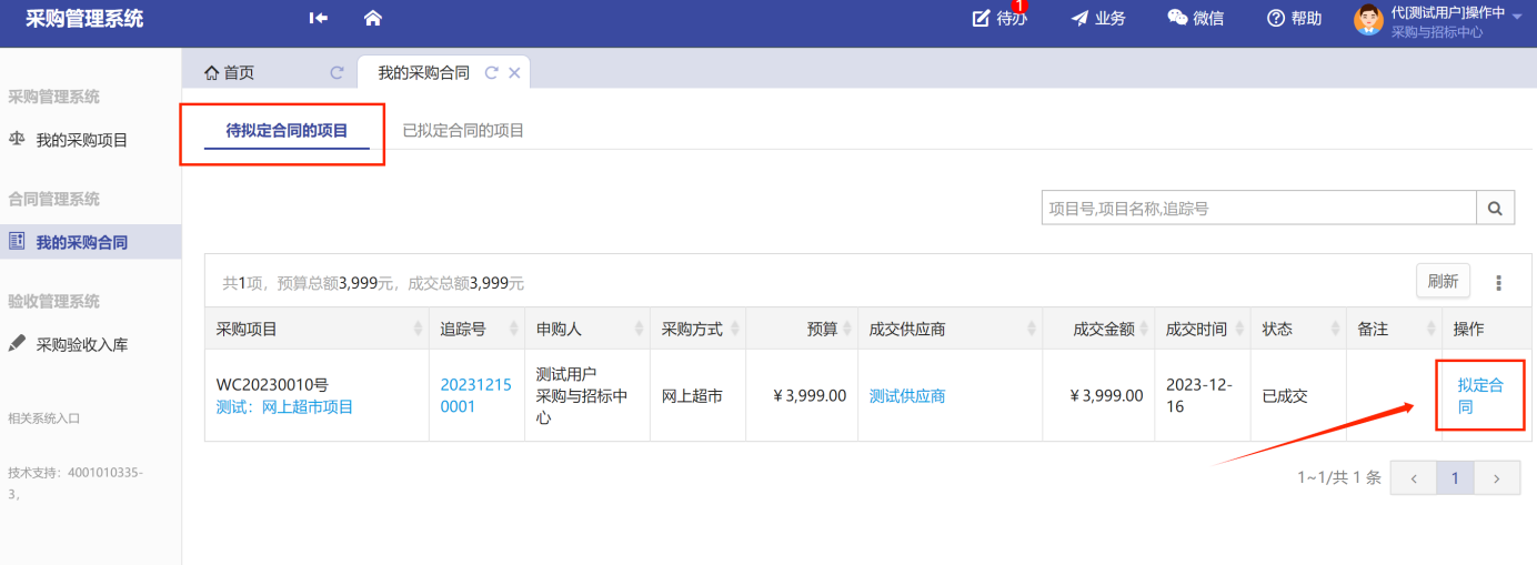 第三步:在【待簽署合同的項(xiàng)目】中,選擇需要擬定合同的項(xiàng)目,點(diǎn)擊“擬定合同”,進(jìn)入合同信息填寫頁面,如圖所示: