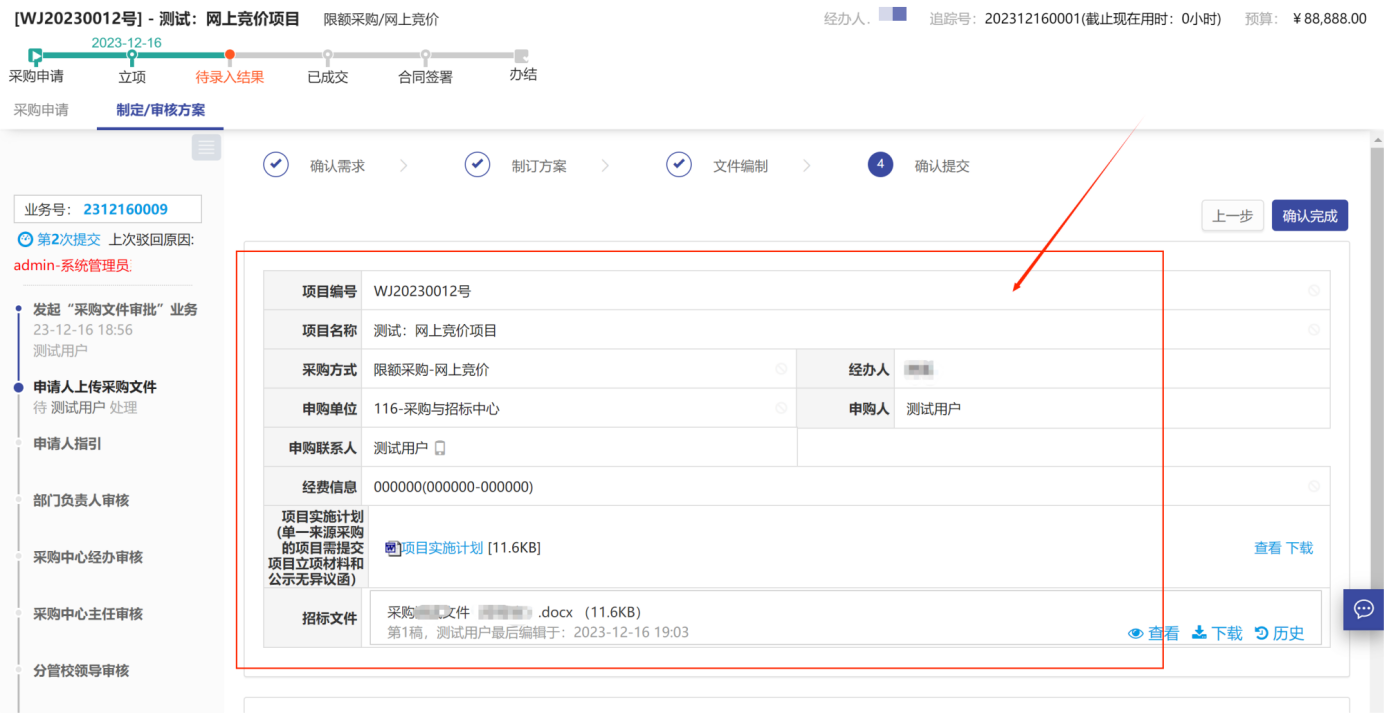 第四步:上傳“采購文件”后,點(diǎn)擊右上角的保存并下一步,進(jìn)入信息確認(rèn)頁面,檢查信息無誤后,點(diǎn)擊“確認(rèn)完成”,如圖所示: