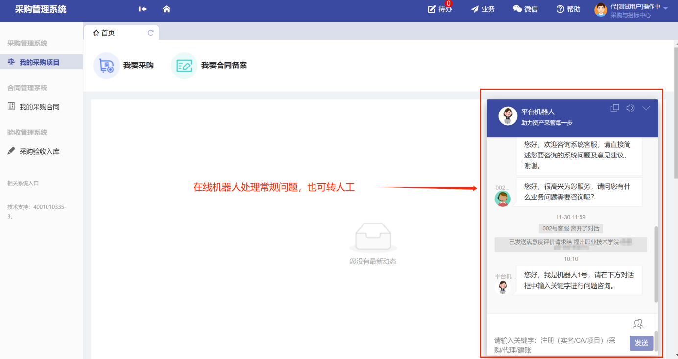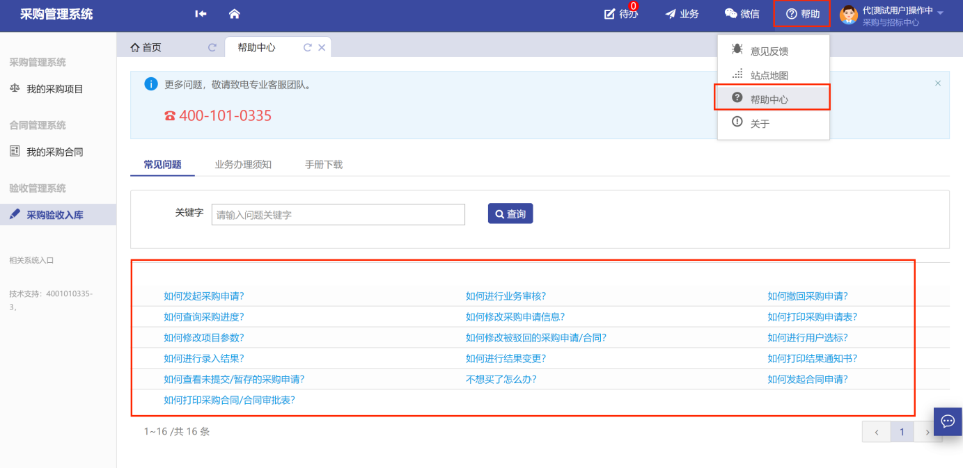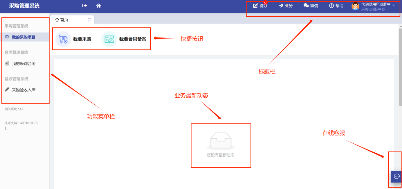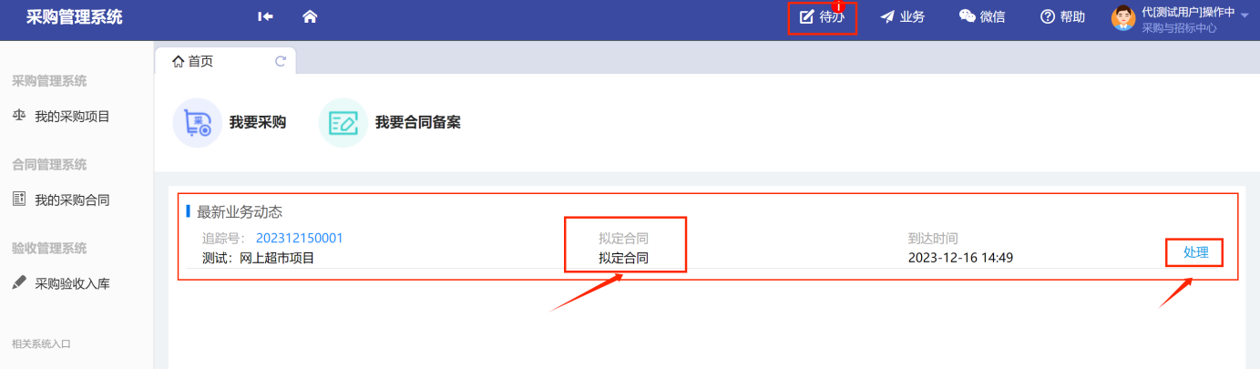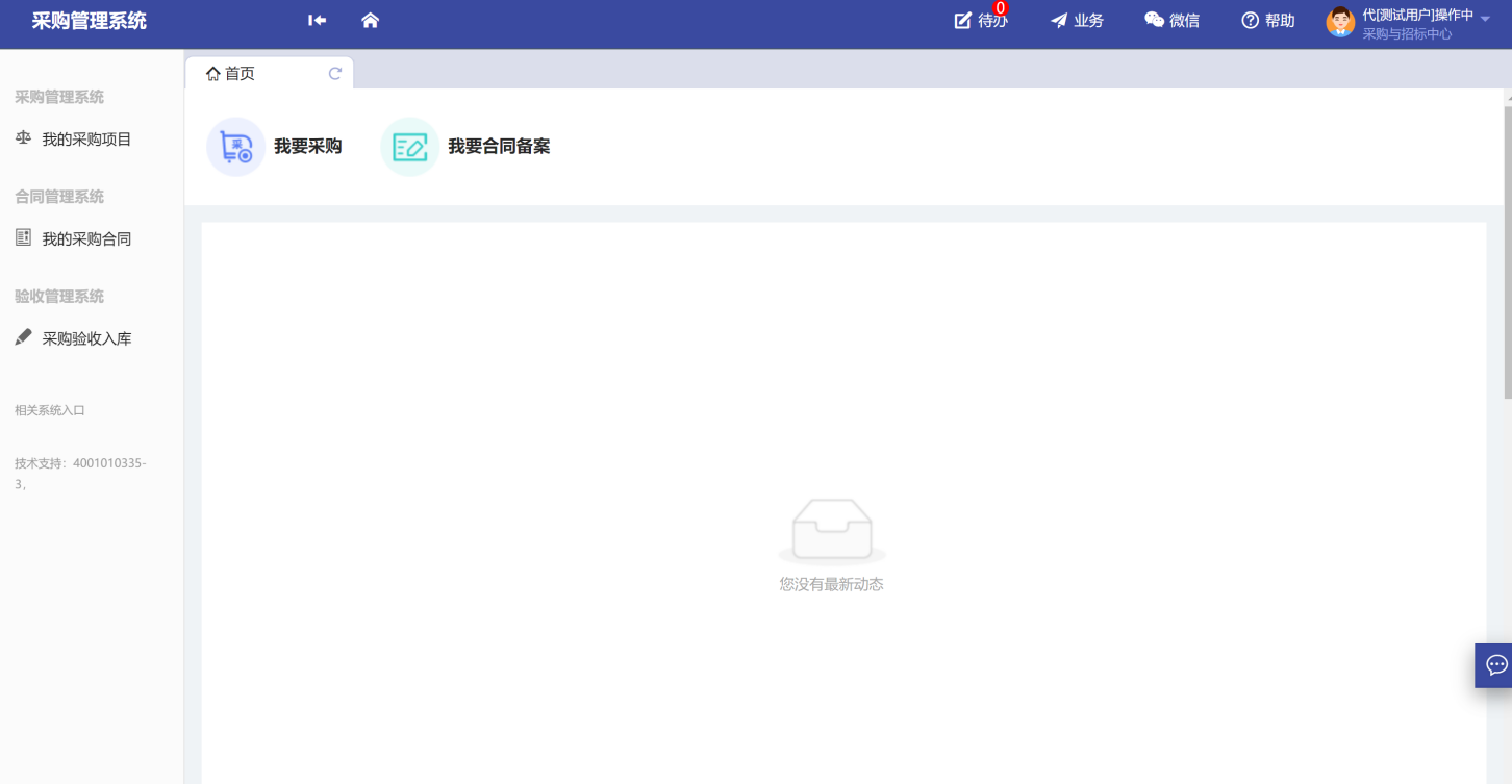 功能菜單模塊下的【采購管理系統(tǒng)】、【合同管理系統(tǒng)】、【驗(yàn)收管理系統(tǒng)】,提供對(duì)應(yīng)業(yè)務(wù)辦理功能。
