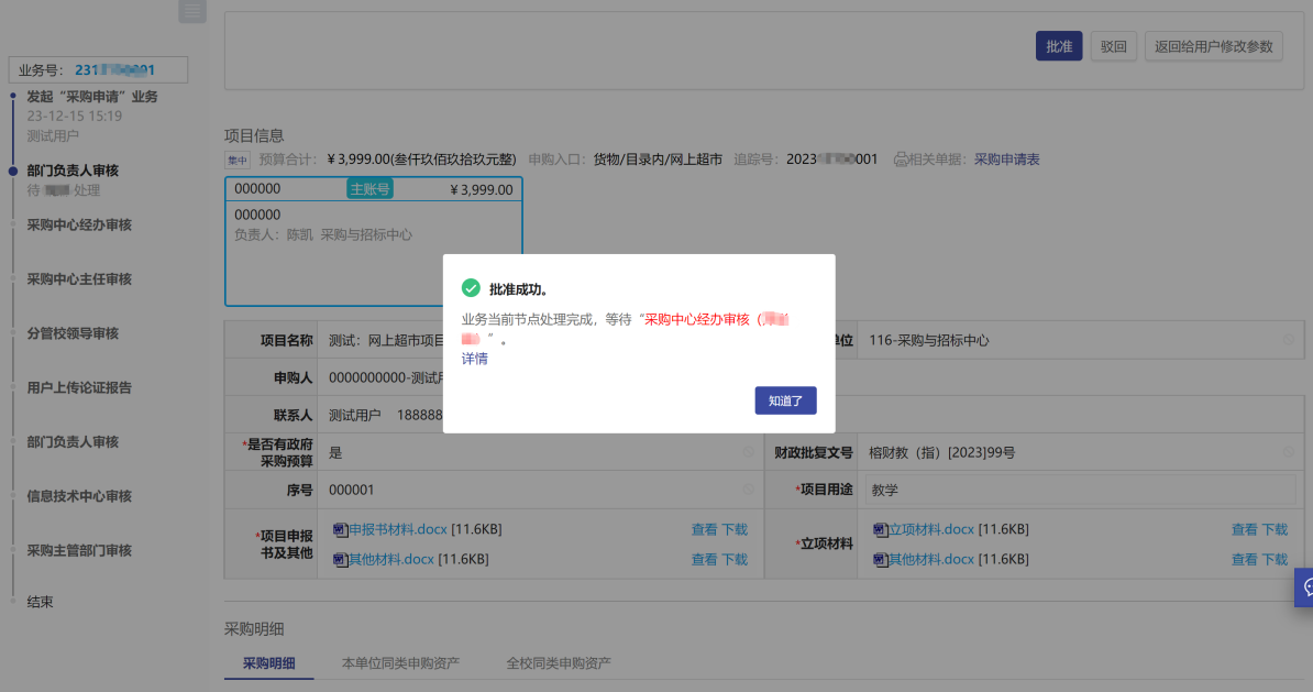 注意:不同的采購入口(采購方式)審批流程會(huì)有所不同,比如限額內(nèi)的【網(wǎng)上競(jìng)價(jià)】的審批流,用戶老師可以通過以上操作,查看自己申請(qǐng)的項(xiàng)目審批狀態(tài),如圖所示: