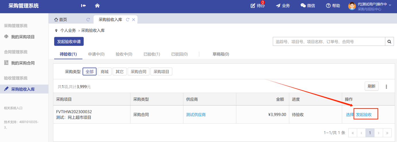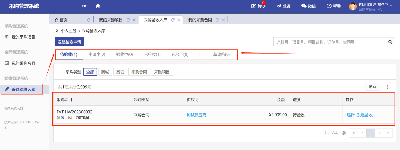 第一步:在首頁點(diǎn)擊“采購驗(yàn)收入庫”,在標(biāo)簽可看到待驗(yàn)收、申請(qǐng)中、驗(yàn)收中、已驗(yàn)收、已駁回、草稿箱,在待驗(yàn)收標(biāo)簽下顯示待驗(yàn)收項(xiàng)目如圖所示: