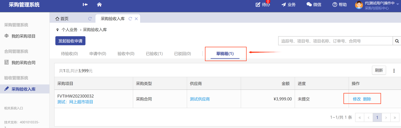 注意:如果項(xiàng)目的驗(yàn)收信息填寫到一半退出,那編輯后的驗(yàn)收項(xiàng)目會(huì)到“草稿箱”里面,可通過修改和刪除的操作繼續(xù)操作,選擇刪除,項(xiàng)目就會(huì)回到待驗(yàn)收標(biāo)簽底下,如圖所示: