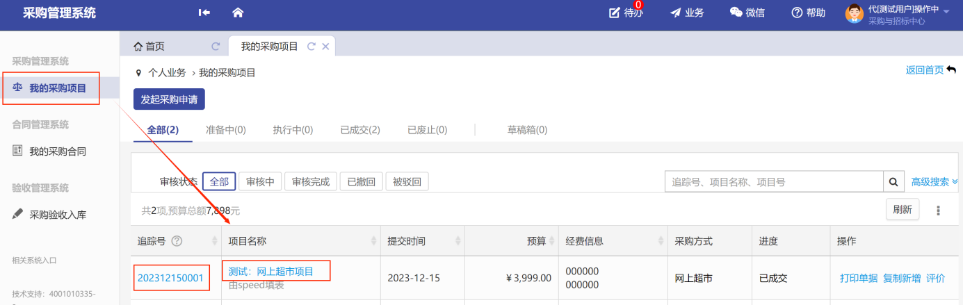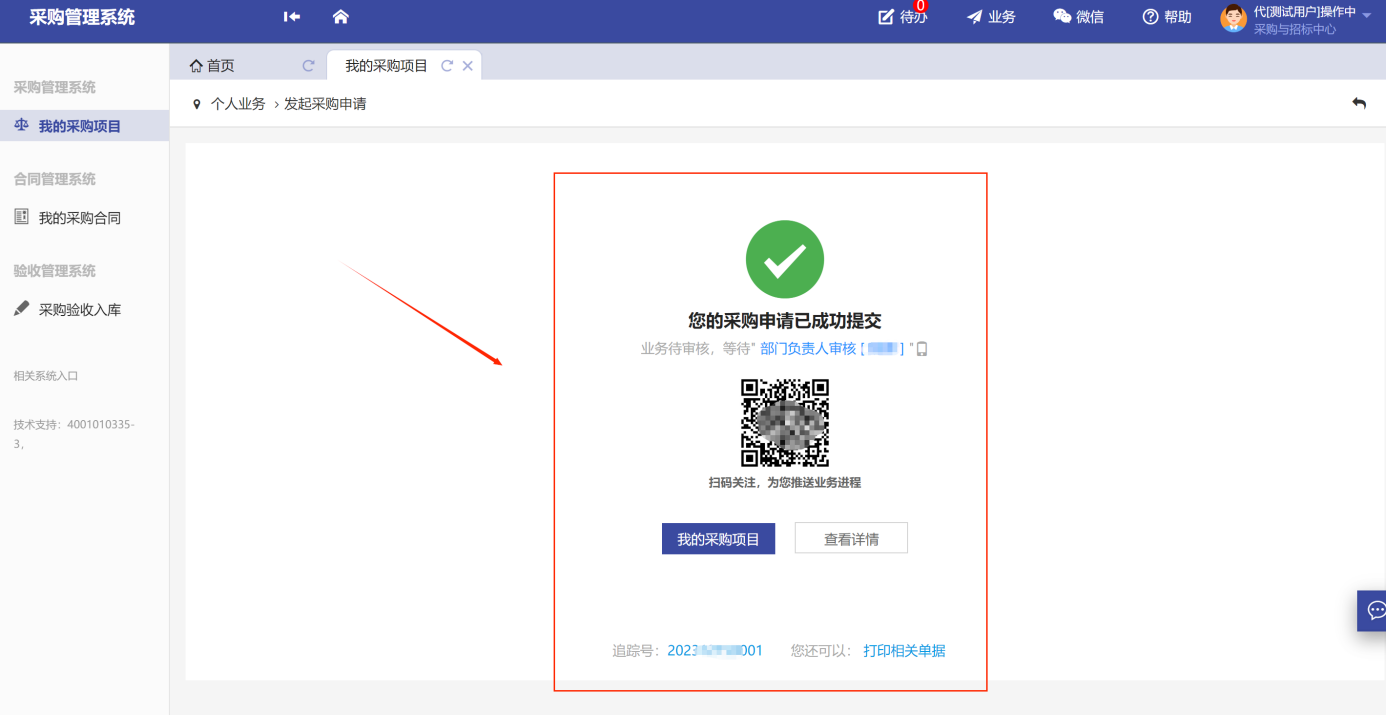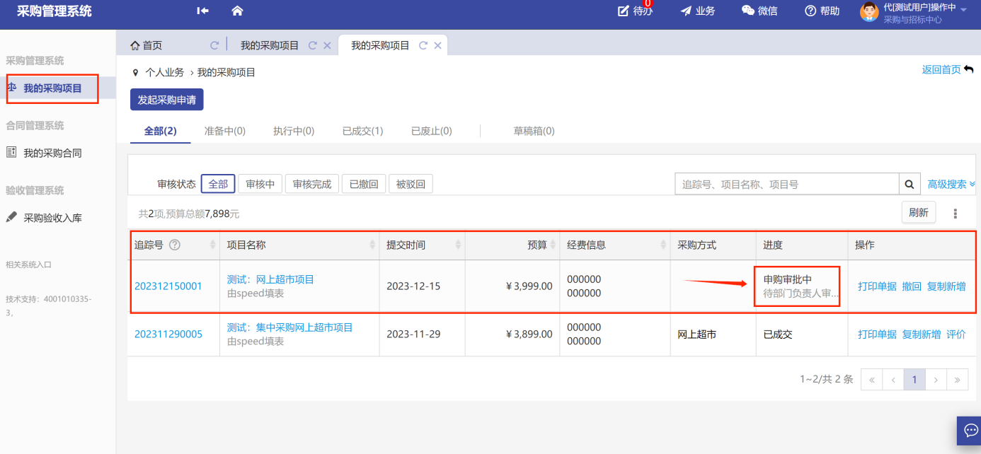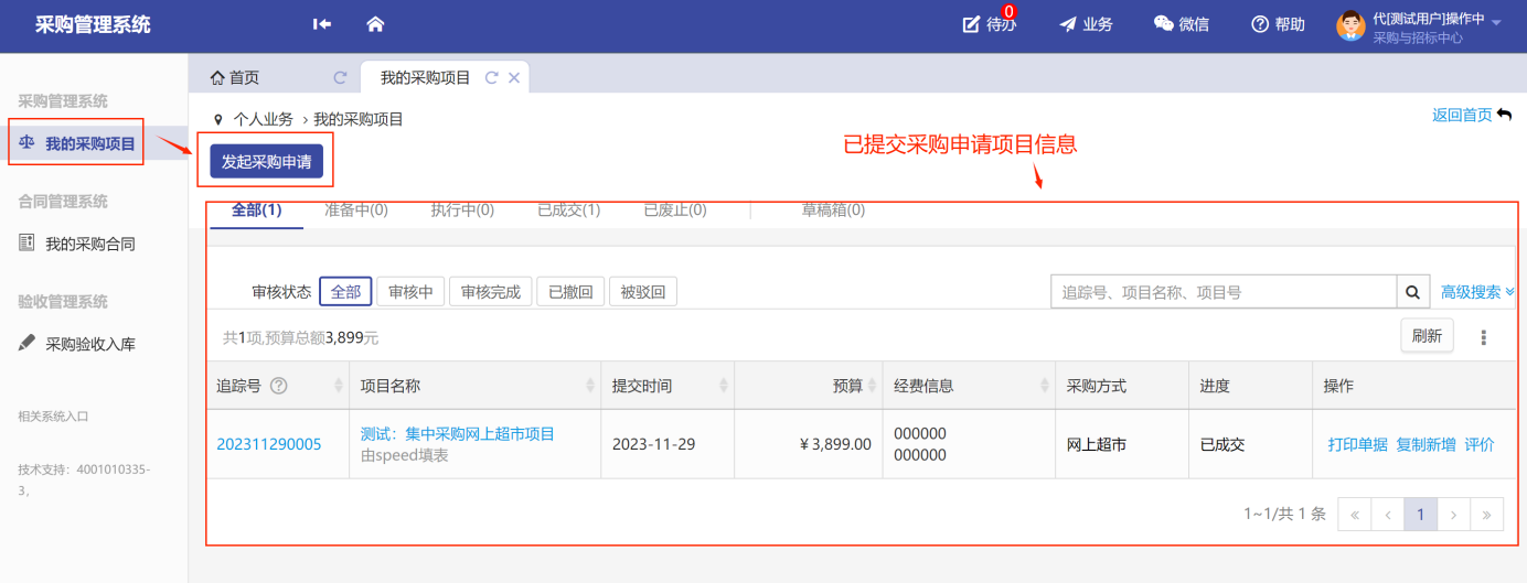 采購申請(qǐng)?zhí)峤怀晒?,可在我的采購?xiàng)目中,如圖所示: