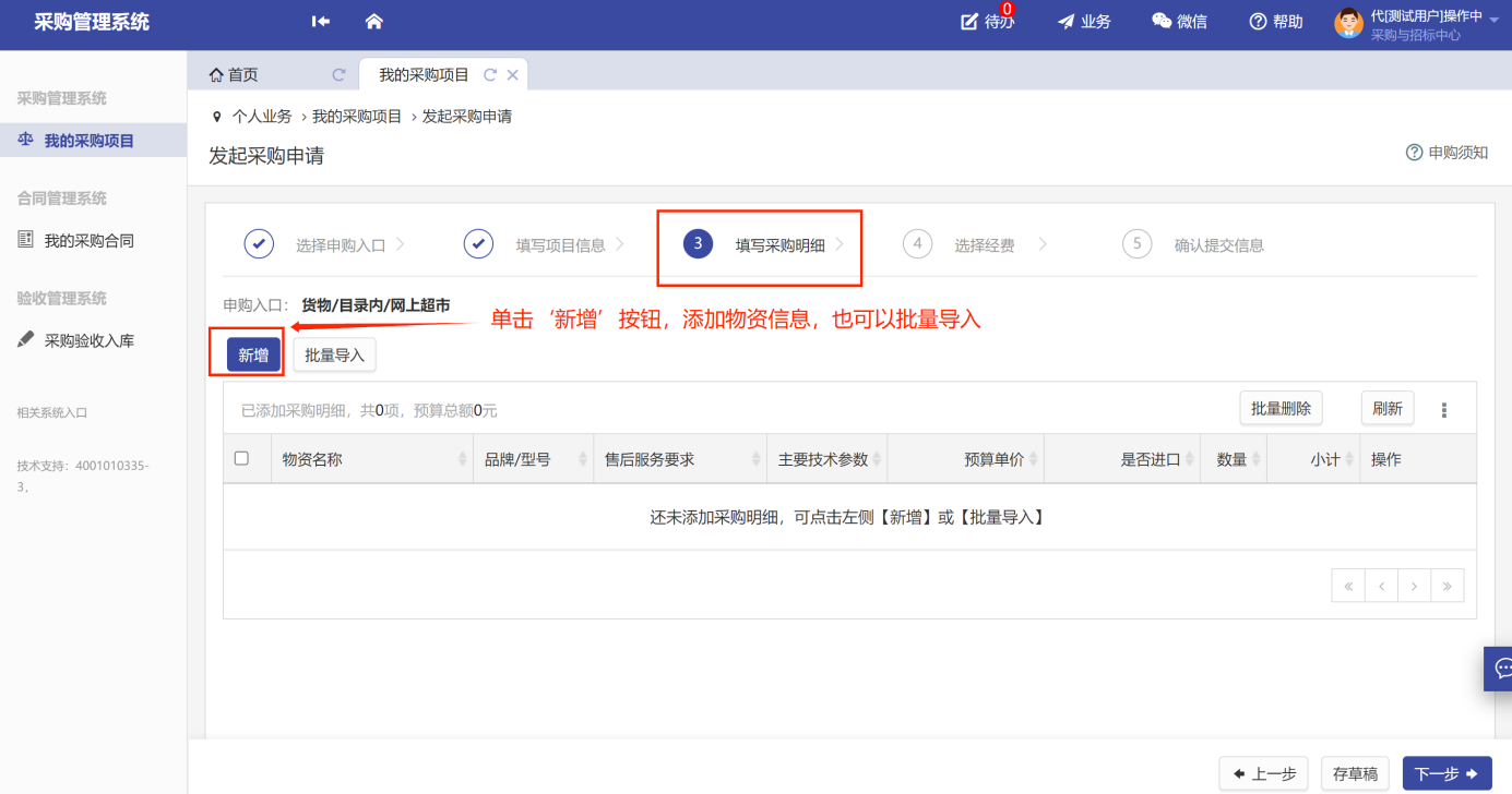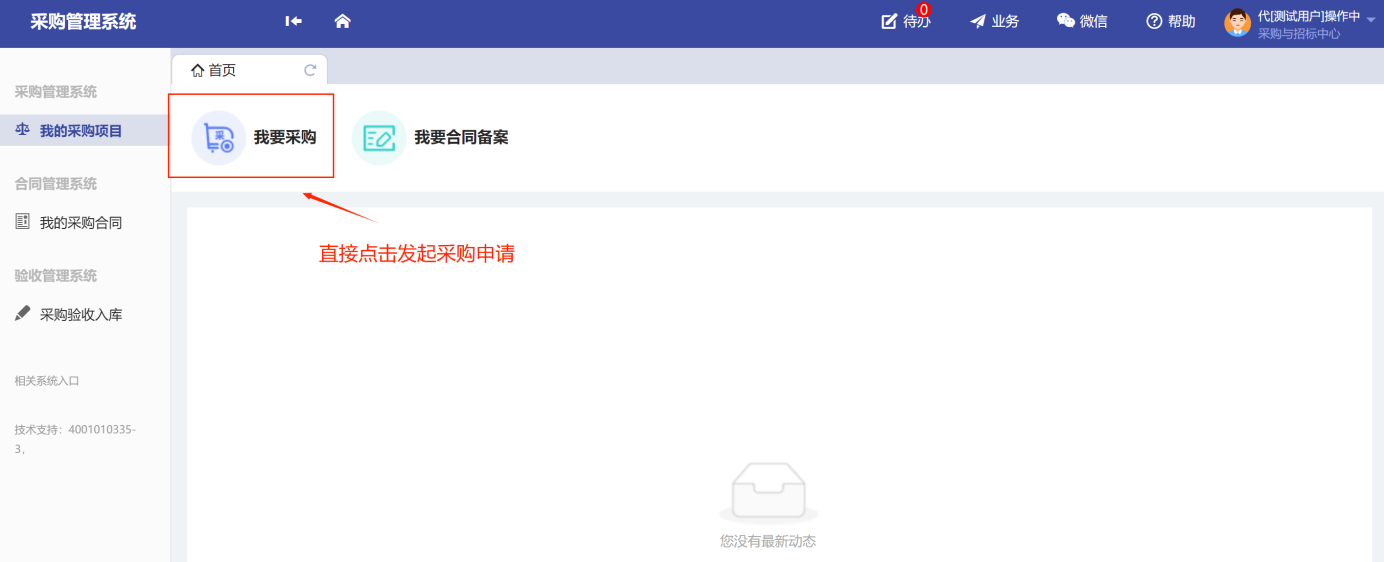 第一步:用戶進(jìn)入系統(tǒng)的主頁面,點(diǎn)擊“我的采購項(xiàng)目”-“發(fā)起采購申請(qǐng)”,如圖所示: