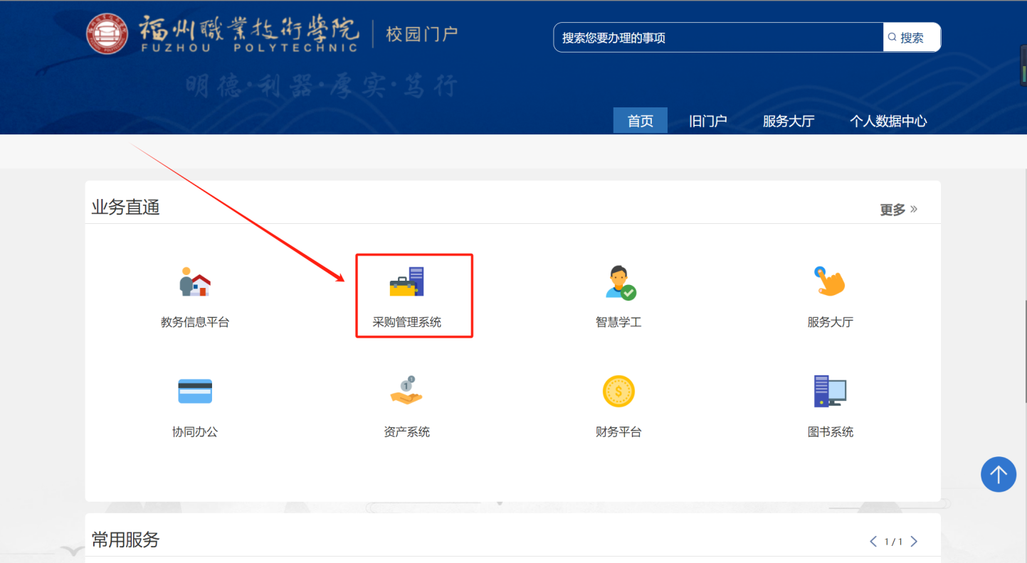 用戶老師登錄后成功后,在“業(yè)務(wù)直通”選擇【采購管理系統(tǒng)】進(jìn)入采購系統(tǒng)首頁,如圖所示: