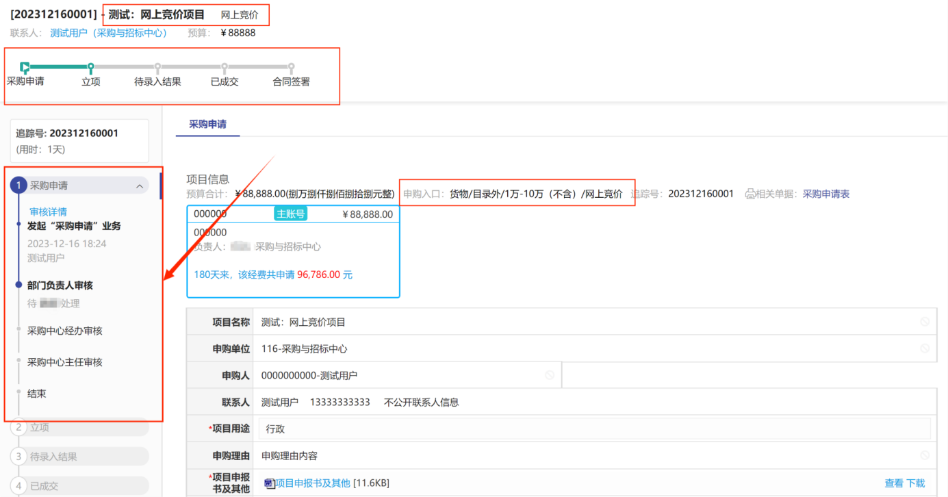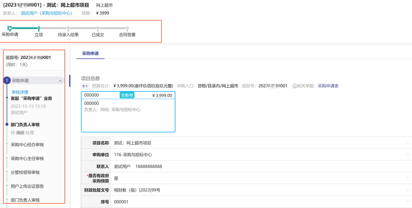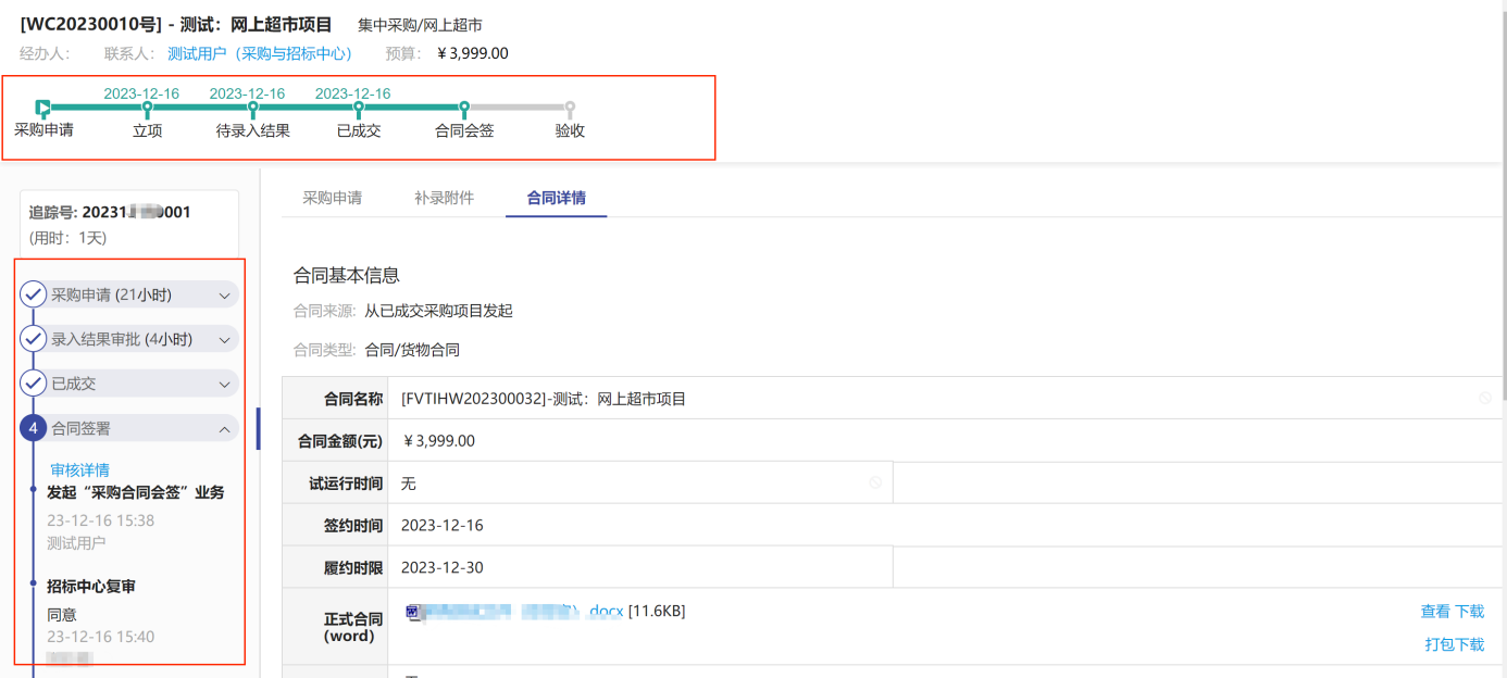 當(dāng)提交合同審核后,可以通過點(diǎn)擊首頁的“我的采購項(xiàng)目”,在點(diǎn)擊對(duì)應(yīng)項(xiàng)目的“追蹤號(hào)”或“項(xiàng)目名稱”,可以看到項(xiàng)目全流程的審批情況,如圖所示: