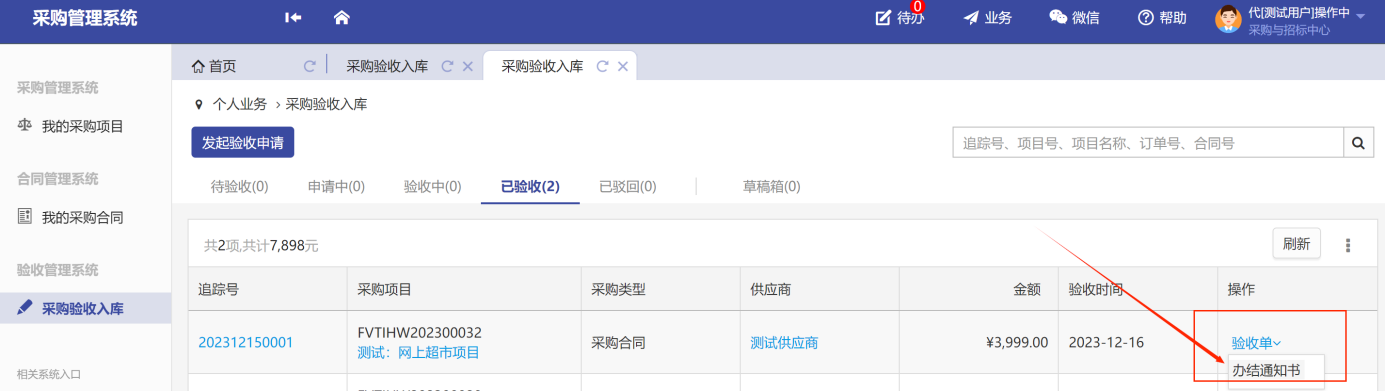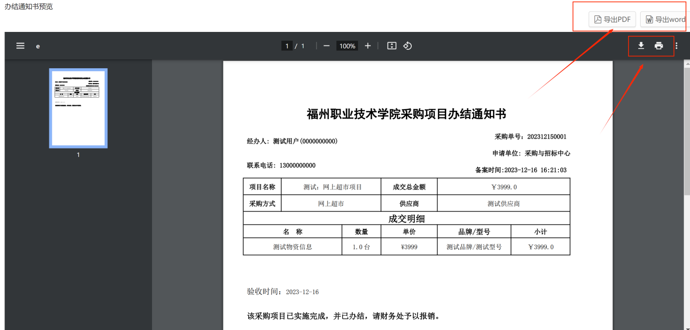 點(diǎn)擊首頁的“采購驗(yàn)收入庫”在“已驗(yàn)收”項(xiàng)目列表里的操作欄里點(diǎn)擊“驗(yàn)收單”,在下拉菜單里有“辦結(jié)通知書”,選擇“辦結(jié)通知書”出現(xiàn)預(yù)覽頁面,用戶老師可以下載文件進(jìn)行打印,如圖所示:
