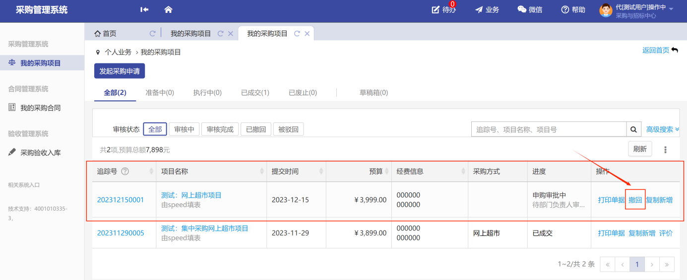 采購申請(qǐng)?zhí)峤缓?,尚無相關(guān)人員審批,如需修改內(nèi)容,可點(diǎn)擊“我的采購項(xiàng)目”-“撤回”撤回申請(qǐng),如圖所示: