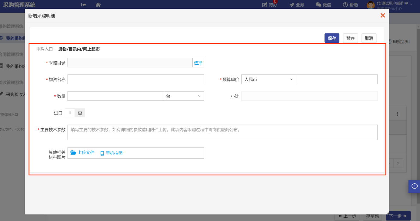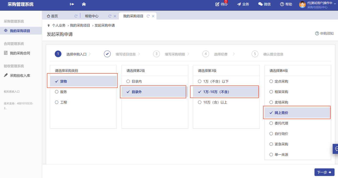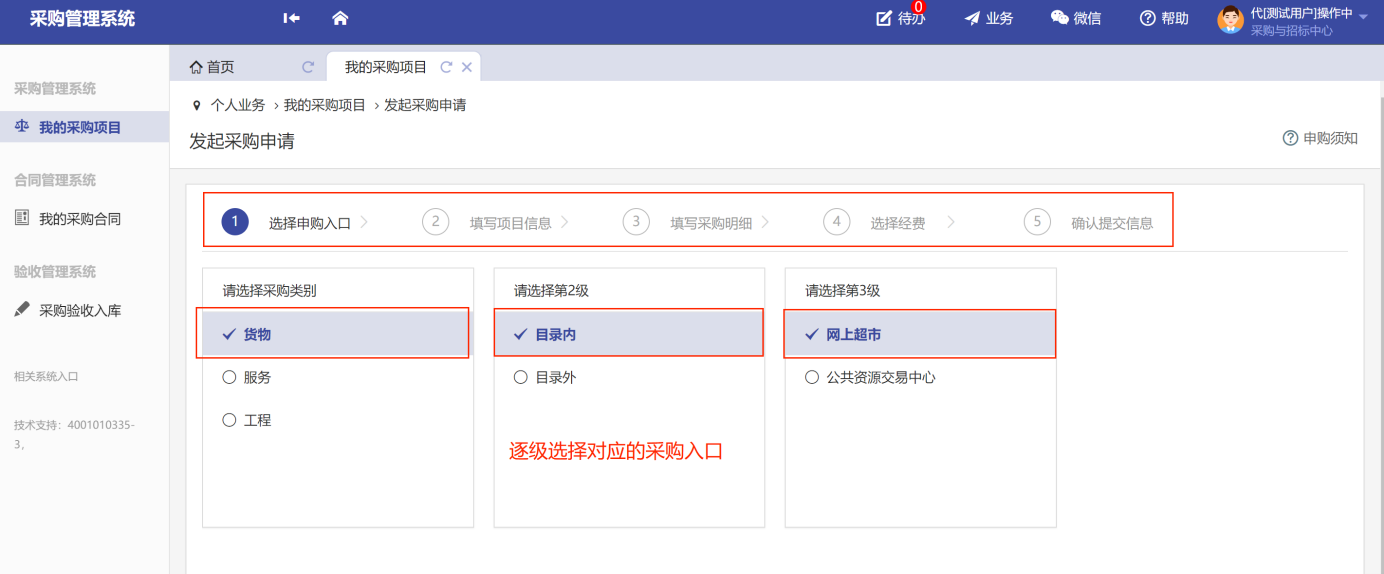 用戶老師根據(jù)采購標(biāo)的的性質(zhì)、金額、采購方式等來選擇采購申請(qǐng)入口,不同的采購申請(qǐng)入口對(duì)應(yīng)可能不一樣的審批流程和審批人,所以用戶老師一定要根據(jù)自己的采購標(biāo)的來選擇對(duì)應(yīng)的采購入口,發(fā)起采購申請(qǐng)。