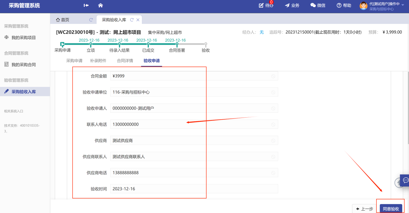 第四步:確認(rèn)填寫信息無誤后,點(diǎn)擊右小角的“同意驗(yàn)收”按鈕,提交驗(yàn)收申請(qǐng),如圖所示: