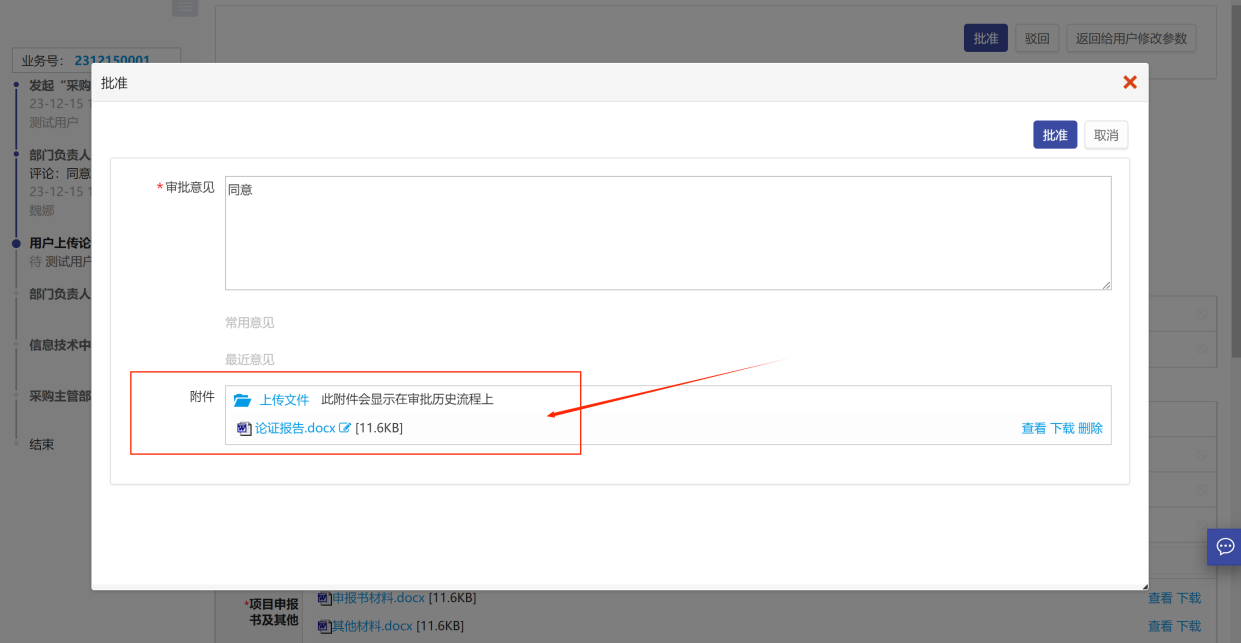 按提示內(nèi)容操作,先點(diǎn)擊批準(zhǔn)按鈕,在彈窗上選擇上傳附件,如圖所示: